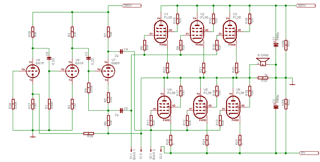 Konkrétan erre a kapcsolásra gondoltam, ahol ugyan ezzel a logikával plusz csöveket pakolnék be egymás után szépen sorba az 1K-s és 39ohm-os ellenállásokkal egyetemben. Csak azért kérdezem egyáltalán működne e, és növelhető lenne e a teljesítmény Ugyan ilyen táp alkalmazása mellett. Illetve mi az a kapcsolásban amit ez esetben még módosítani kéne. Kicsit hasonló lenne a cél mint egyes OTL erősítőknél ahol bepakolnak egy csomó elektroncsövet. Ha gerleimarci idézetét nem értelmezem félre, esetleg adott mennyiségű cső alkalmazása esetén még az illesztőtrafó is elhagyhatóvá válna?