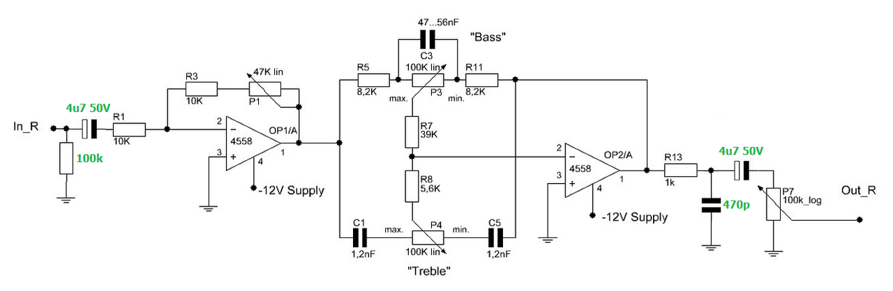 Szia! Áthidaló megoldás: 47k lin poti és a kimenetről jövő 10k helyén 68k. Ettől ugyan kisebb lesz az elérhető magas-vágás, de nem szoktak reklamálni.