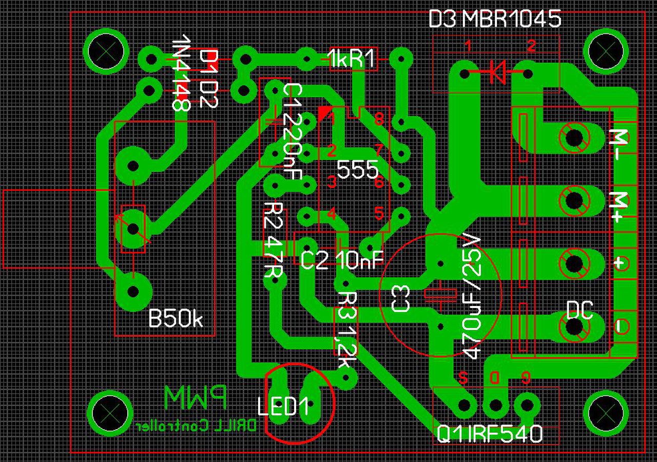 Szia. Az alkatrész értékektől nem véletlen tértem el. A dióda és a FET értéke direkt nem az ami a rajzon van, mivel nem 20A-t akarok kapcsolni. A 220n-es kondenzátorral terveztem a frekvenciát alacsonyabbra vinni, hogy ne sikitson a motor. A LED1 és R3 az én kiegészitésem, visszajelzés gyanánt.