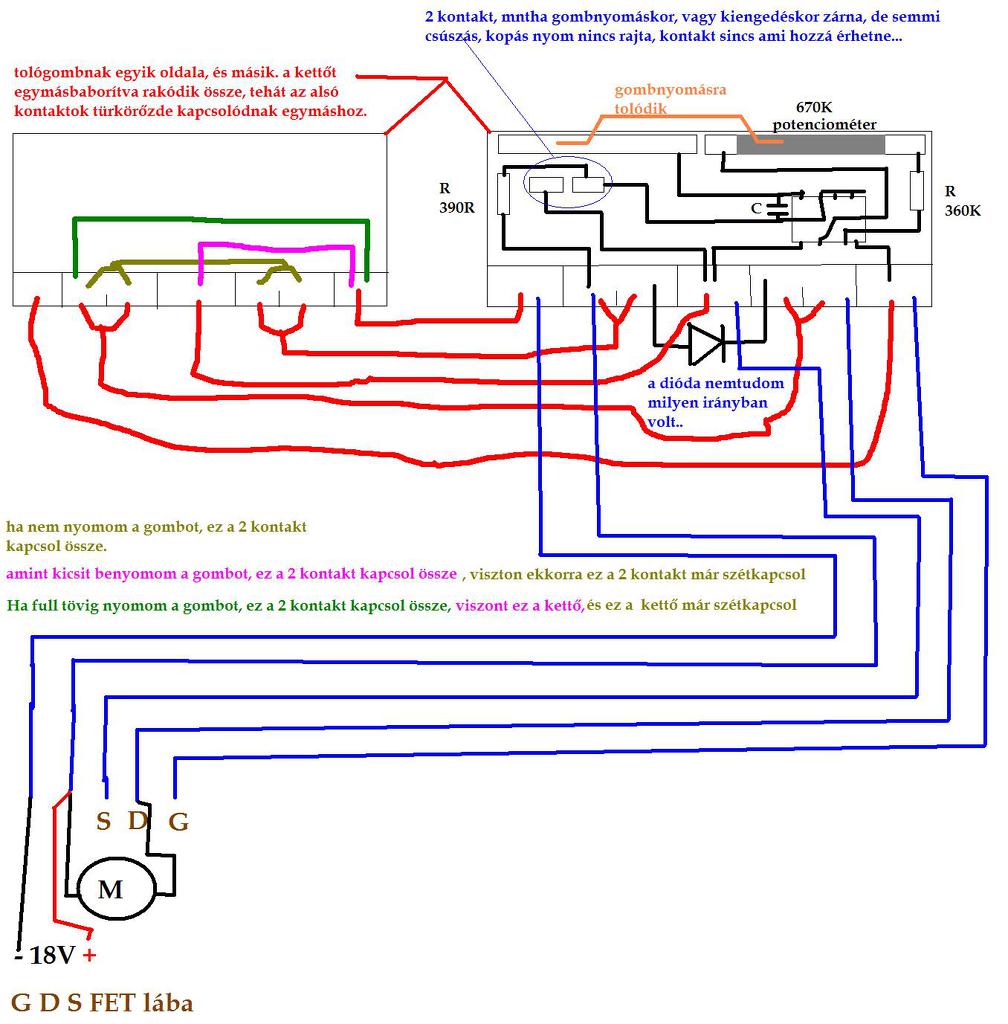 A két szélső kapcsoló állás most nem érdekes, mert elengedve rövidre zárja a motort, teljesen benyomva pedig közvetlenül kapcsolja az akkut a motorra kihagyva minden mást. A köztes állapotban dolgozik az elektronika. Visszarajzoltam a kapcsolást, hogy tisztább legyen a kép. Nézd át te is, hogy minden ok? Nem tudom melyik az igazi ic 1-es lába, itt önkényesen választottam. Az alkatrészek tokozása a fet és dióda típusa sem fontos most, és a poti két szélének az állása sem, ettől akinek ismerős az elrendezés, az meg tudja mondani, hogy lehet-e ilyen ic-t beszerezni és milyen néven.
