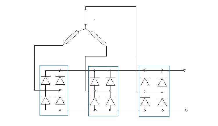 Ha a csillagpont nincs kivezetve, esélytelen. Független tekercseknél meg lehet oldani, csak nem célszerű. 1 db híddal + 2 diódával meg lehet oldani, ha úgy gondolod, hogy komoly hűtés kell és jobb a gyári tokozott, akkor 1 kocka + a másik kockának a fele 3 f hídba kötve használható.