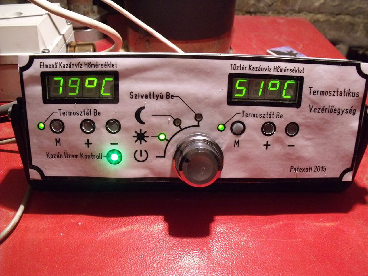 Sziasztok! Elkészült a vegyes tüzelésű kazánomhoz a szivattyú vezérlő.Méri a hőmérsékletet a kazán tetején és a tüzelőajtó magasságában mely alapján kapcsolgatja a szivattyút egy szobatermosztáttal kiegészítve. A túlmelegedés elleni védelem ha az eszköz meghibásodik egy csőtermosztát bekapcsol 90 fokon. Egy kontroll áramkört is készítettem bele mely a szobatermosztáton is szépen jelzi vissza a kazán állapotát.