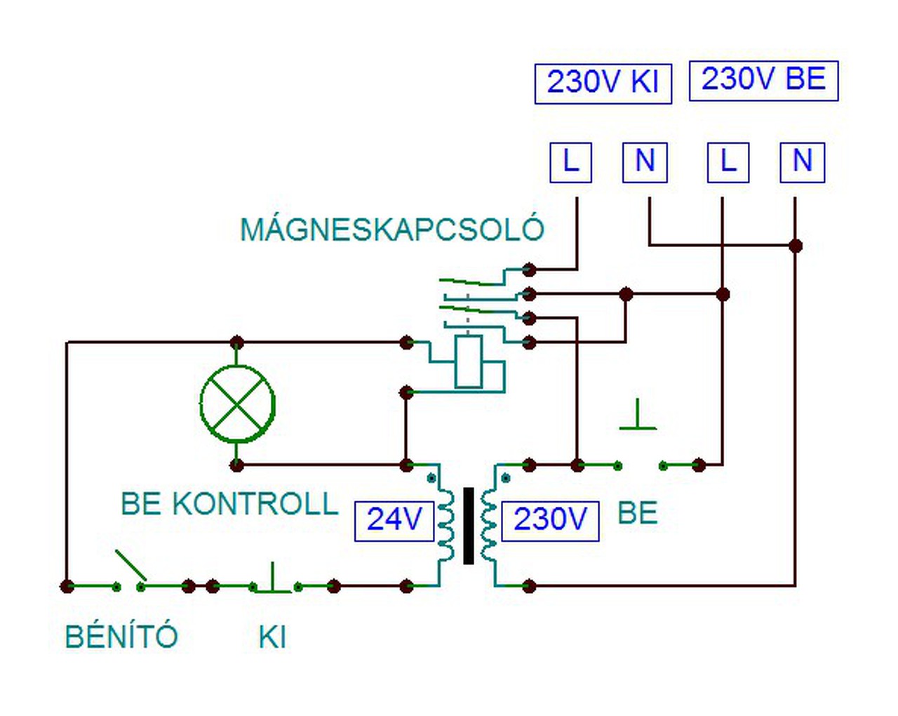 Egyébként meg veszélyes kivitelezésnek tartom annak ellenére, hogy működőképes. Azért mert az egyébként is egymás mellett lévő nyomógombok különböző feszültségek vannak, ezek közül ráadásul az egyik, a 230V életveszélyes. Gondolom ezt csupán magadnak készítetted el, nem pedig "idegen" helyen. Azért alkalmaznák a különböző feszültség alatti vezetékek a szokásos színnel való megkülönböztetést is. A 24V-hoz kék színt, 230V-hoz feketét mivel ez utóbbi a hálózati feszültségen van közvetlenül.