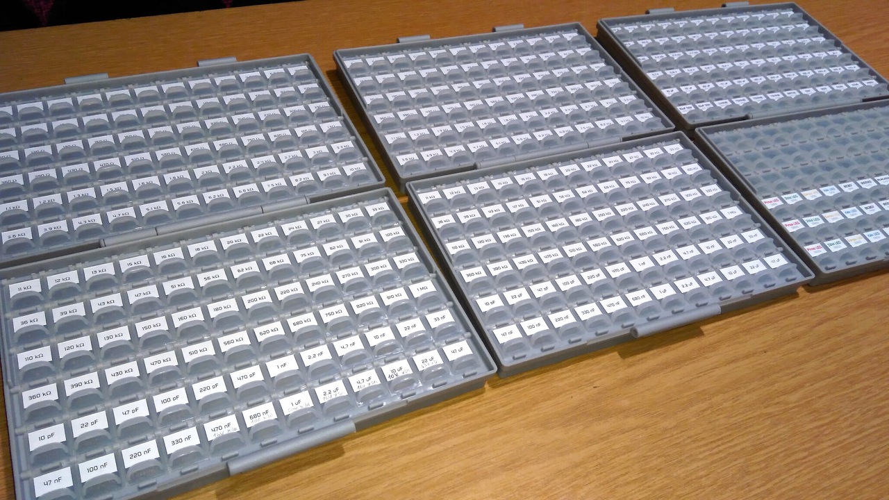 Az eddigi egy AideTek tárolóm mellé vettem még kettőt, hogy be tudjak rendezkedni a 0805-ös tokozásra is. Véleményem szerint ennél jobb SMD alkatrész-tárolási lehetőség nincs. Akkora mint egy könyv így könnyen szállítható, 500-600db alkatrész simán belefér egyetlen rekeszbe, sok (144db) kis rekesze van és minden egyes rekesz külön-külön nyílik. Felmerülhet a kérdés hogy ez mit keres itt ebben a topikban, hiszen mi ebben az építés?! Nos a helyzet az hogy a kis rekeszek felcímkézése, a címkék kivagdosása, a rekeszek alkatrészekkel való megtöltése három teljes napba telt, szóval van munka benne bőven. Már az alkatrészek beszerzése sem volt egyszerű; a Lomexből külön felhívtak mobilon hogy a számlázási rendszerük csak 140db tételt tud kezelni.