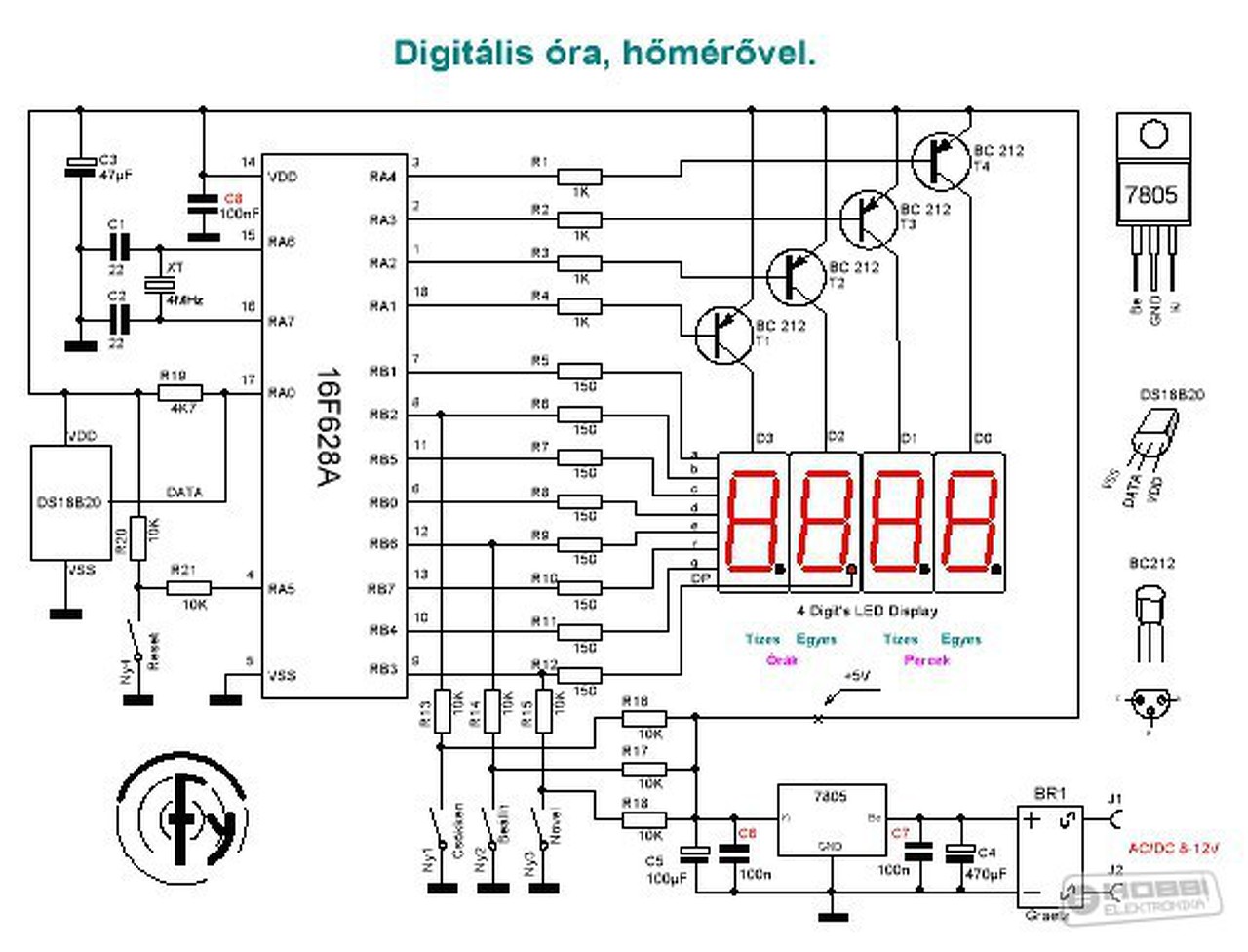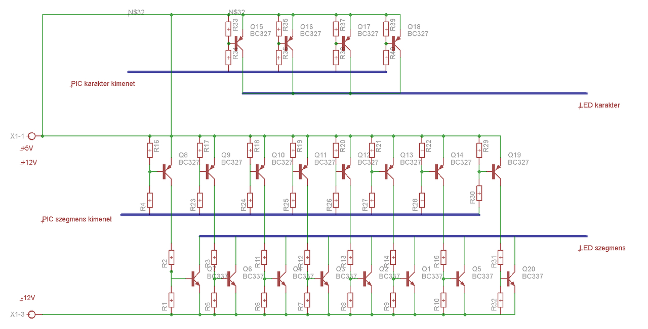 Azért egy kicsit bonyolítanám..Ami még érdekesség, NEM a negatív a közös a két tápban, Hanem a +5V és a +12V van összekötve.Sajna a szegmens ledekkel soros ellenállásokat kifelejtettem. A tranzisztorok BE vel párhuzamos ellenállása lehet elhagyható.