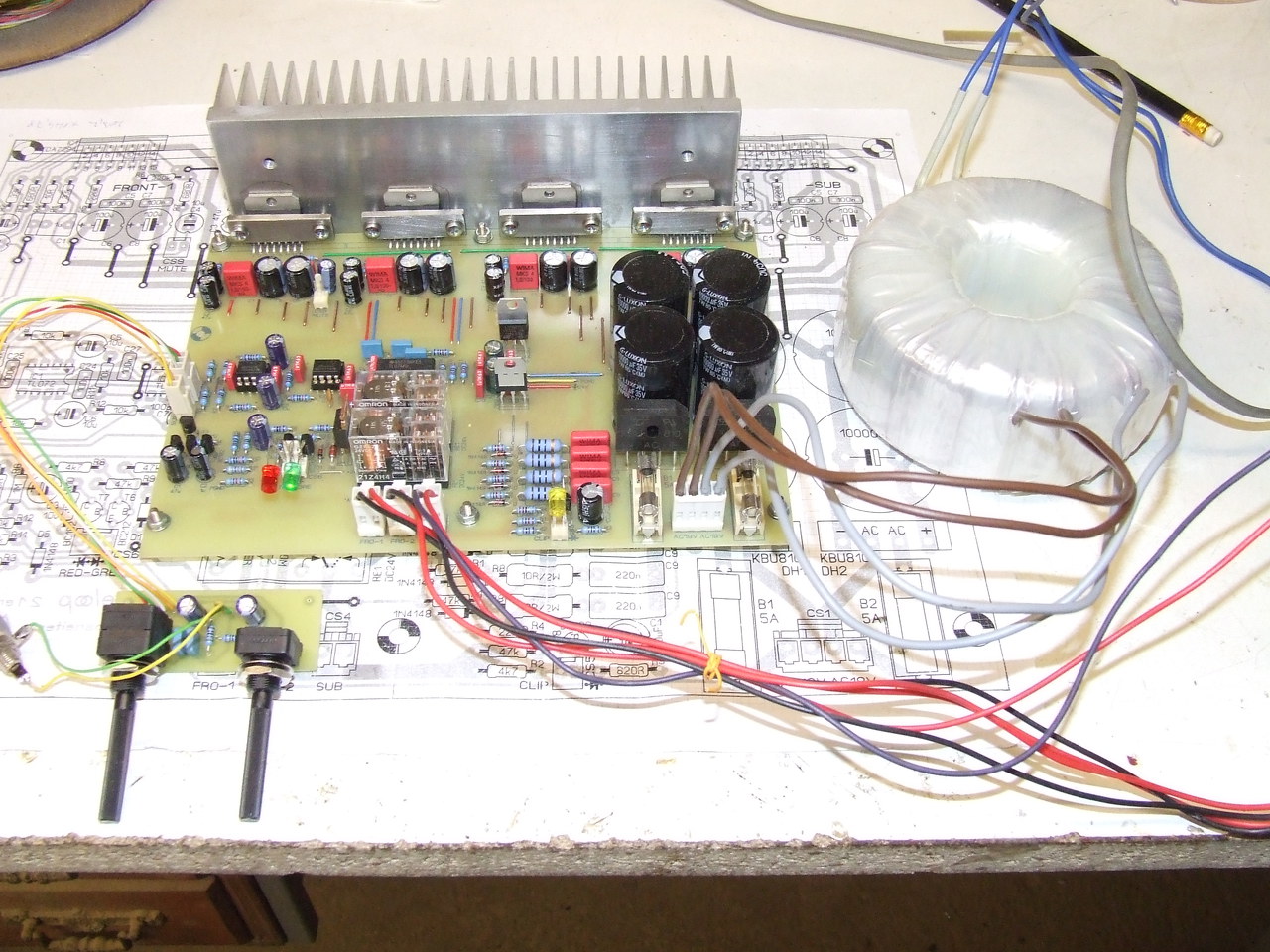 Elsőre indult, semmilyen huncutságot nem tapasztaltam. A fotón lévő bordával, CLIP közeli kivezérlésnél, még éppen tapintható a borda, de határozottan meleg. A tápfeszültség (CLIP-ig vezérleve) kb. +-26,6V (zenével mérve). A használt frontsugárzók névleges impedanciája 4R, a SUB pedig 8R (2 sorba kötött 4R-os).