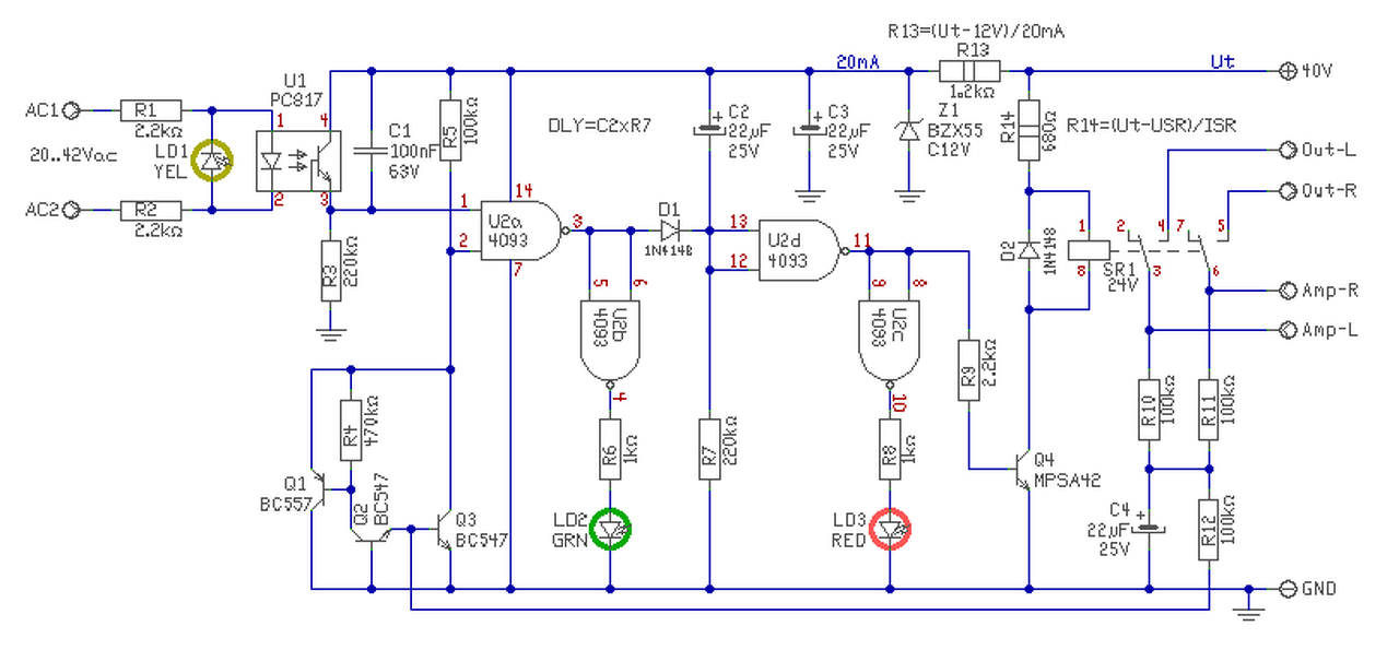 Van egy ilyen erősítőm és ez a védelem. A képen láthattok két bekötést. Mind a kettő esetében életbe lép egyből a védelem. Ha az erősítő nem üzemel akkor is bekapcsol a védelem ahogyan látjátok a "2. bekötést". Ha a két táp negatívját nem kötöm össze akkor nem lép életbe a védelem, illetve akkor sem lép életbe a védelem ha az erősítő a + tápot nem kapja meg. Az erősítő maga teljesen jól működik. Nincs egyenfesz a kimeneten. Egyszerűen nem tudom elképzelni mi lehet a gond. Tudnátok nekem ebben segíteni ?
