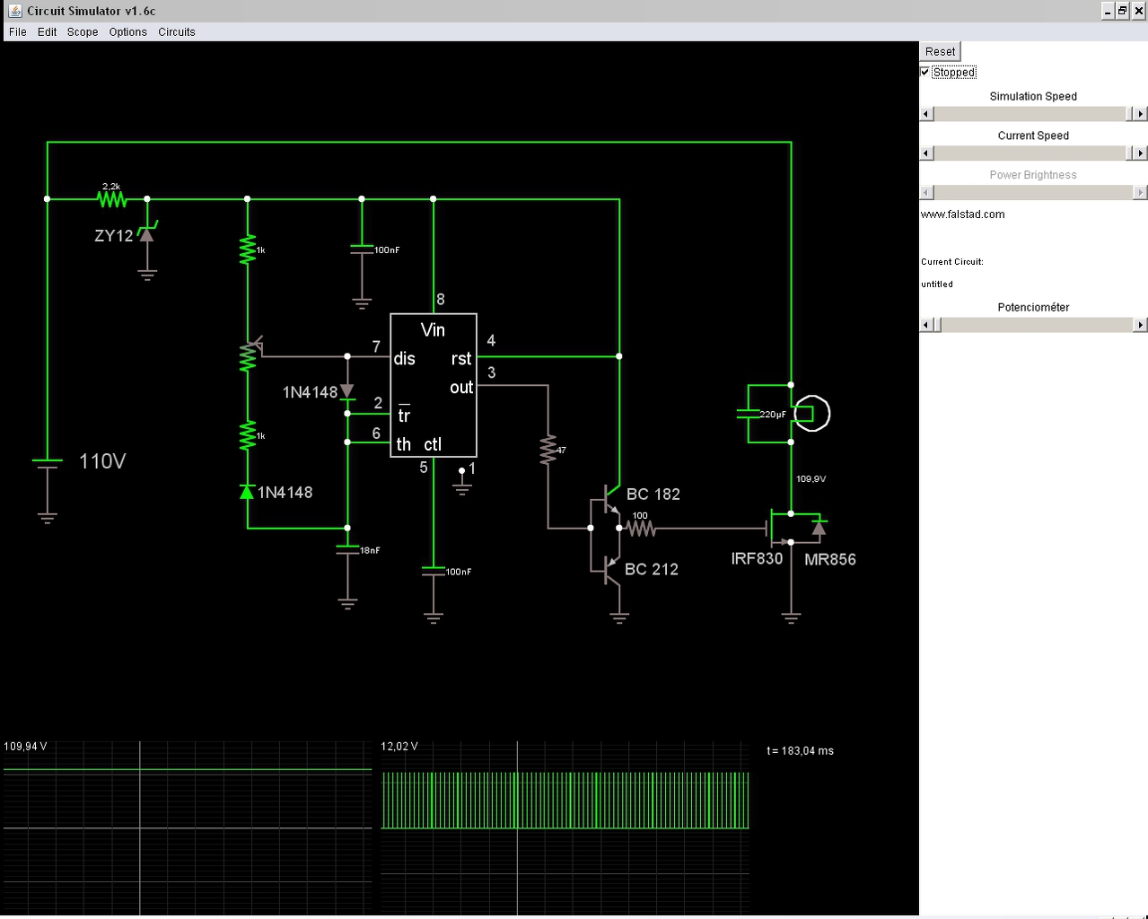 97V-om van egyenirányítva, pufferelve. A motor 110V-os. Ezért céloztam meg a 110V-os feszültséget, hogy legalább a fordulatszám-szabályzóm patent legyen a motorral. Trafót tudok cserélni később. Tudom, sokan a fejemhez vágtátok már, hogy lehetne jobbat, szebbet, lcd-t stb. De szeretnék végre egy nem mikrokontrolleres verziót is. Annak ellenére, hogy Propellerrel röhögve meg tudnám oldani. Szeretném megérteni a miérteket is. A gate ellenállás helyett javasolták sokan itt éppen ezt a tranzisztoros megoldást. Ez elég gyors és a parazita kapacitásokat le is süti a földre. Ha megnézed a BC212-t éppen a 47 Ohm-ot rángatja le a gnd-hez. Ha beteszek egy fix 47 Ohm-ot a gate és a föld közé akkor fel sem tudom húzni a fetet nyitófeszültségig.. Most szimuláltam le - ki sem tud nyitni.