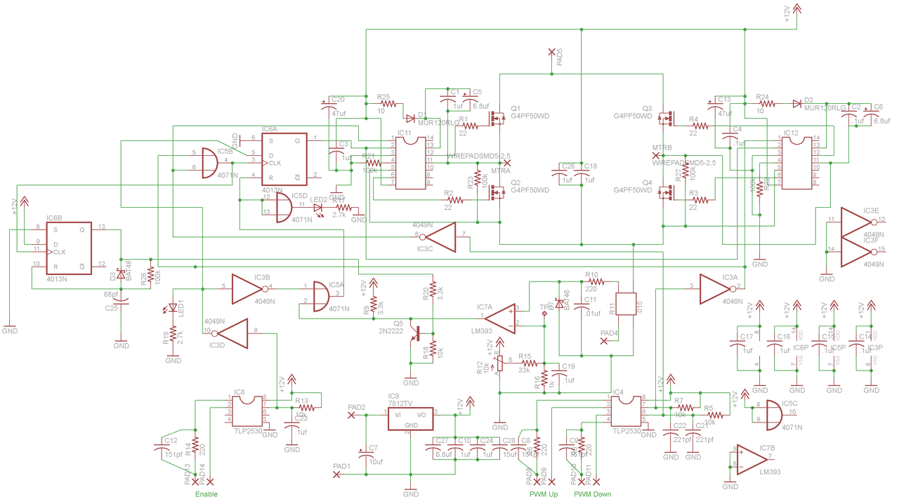 Szia! Igen - ezt a rajzot én is megtaláltam. Van már egy vezérlőm, de ha már belekezdtem, szeretnék végre egy olyan áramkört ami tényleg kellően körül van járva. Sokan írták, hogy az IRF 830 alkalmatlan a feladatra. Nos van rajta egy 10cmx10cm-es hűtőborda és jéghideg. Tökéletesen bírta eddig a strapát ugyanaz a fet, pedig sok butaságon túl van már. Ráadásul van belőle vagy 200db. Az volt a fura, hogy tulajdonképpen a kínai 555-ös vezérlőben sem a félvezetőkkel volt a gond, hanem egy nyavalyás potméterrel. Az egyetlen dolog, ami miatt elkezdtem kicsit más megoldáson gondolkodni éppen a poti. De ezt már befejezem akárhogy is. Mikrokontrollerrel, p8x32-vel röhögve kész lettem volna, akár fordulatszám kijelzéssel, fordulatszám visszacsatolással együtt is. Sőt nyomógombbal beírhatnám a kért fordulatot. De használhatnám a Mach3 pwm-et is. Csak egyszerűen nem hagy nyugodni a dolog, hogy a neten annyi 555-ös pwm áramkör van és mindegyik hibádzik valahol. Ráadásul a gyerek gokartja is készül - arra is kell valamilyen megoldás - és ez attól nincs is nagyon messze, mivel az a motor is 250W-os.