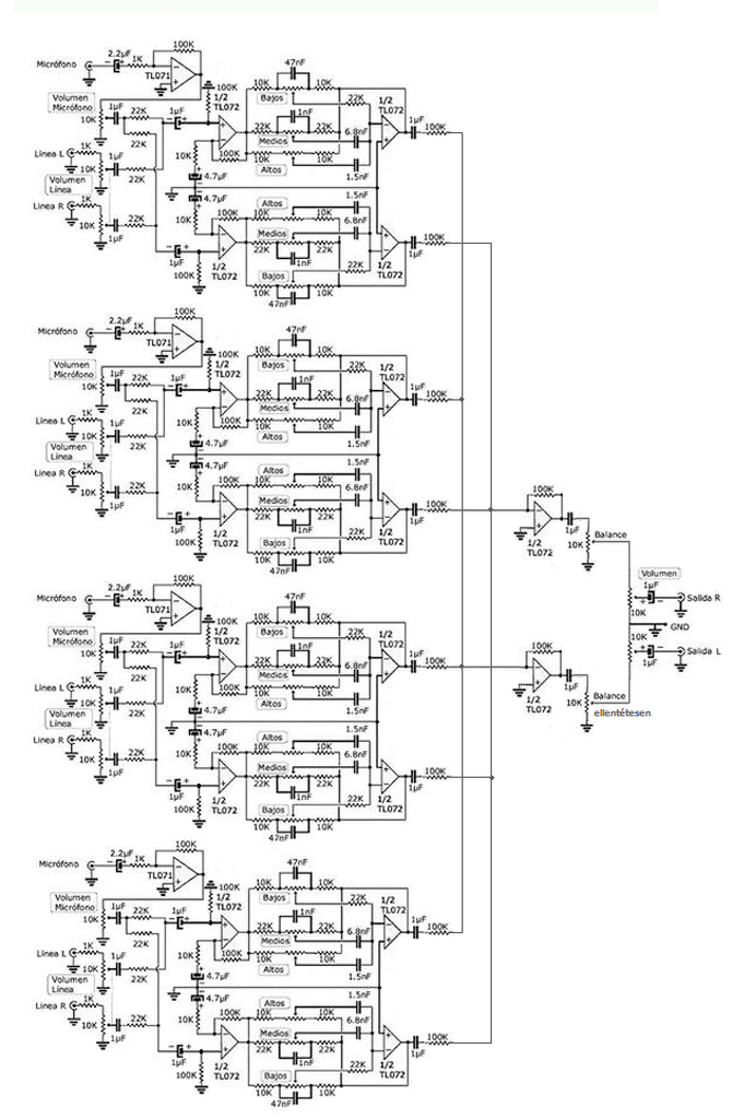 De ha mást szeretnél, pl. n db mikrofont és m db vonaljelet keverni egy közös hangszínszabályzóval, akkor a bal oldalon a TL072-esek előtti részt elég sokszoroznod.