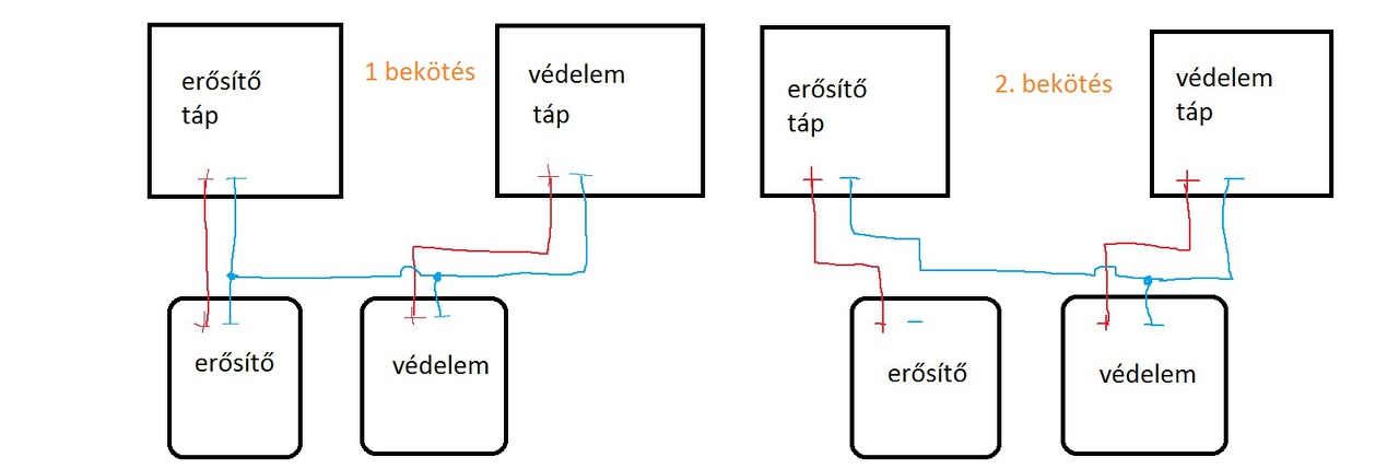 A képen láthattok két bekötést. Mind a kettő esetében életbe lép egyből a védelem. Ha az erősítő nem üzemel akkor is bekapcsol a védelem ahogyan látjátok a "2. bekötést". Ha a két táp negatívját nem kötöm össze akkor nem lép életbe a védelem, illetve akkor sem lép életbe a védelem ha az erősítő a + tápot nem kapja meg.