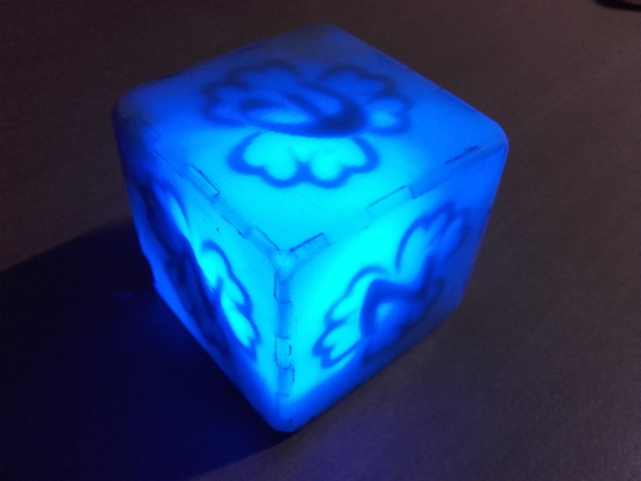 Ismét egy ajándék. A baráti társaságom egyik hölgy tagjának az unokatestvérének a kislánya odavan a kockákért. Próbáltam valahogy összepárosítani az elektronikával, a végeredményt látjátok a képeken. Röviden úgy működik, hogy ahogy forgatjuk a kockát mindig más-más színben világít, amit a 3 darab dőléskapcsoló állapota határoz meg. A belsejéről elfejeltettem képeket készíteni, így csak szavakkal tudom átadni: a tápot egy mobiltelefon akkuja szolgáltatja, a fényeket 2 db közös katódos RGB-LED adja. Amint már írtam, kapcsolóelemként 3 darab dőléskapcsoló (golyós) került beépítésre. Töltés miatt kapott egy micro-USB csatlakozót is. A kocka oldalai 2mm vastag üvegszálas lemezből készültek. Minden oldal belsejére a kislány nevének egy-egy betűje került (Dzseni). Az oldalak kávakötésszerűen lettek összeillesztve, valamint poliészter műgyantával ragasztva. Sajnos az illesztési vonalakat nem tudtam tökéletesen eltűnteni, valamint a viszonylag nagyméretű akkumulátor miatt a fény nem tudja kitölteni 100%-osan a kockát. Amit még technikai szempontból fontosnak tartok, hogy a LED-ek gyárilag domború fejűek voltak, ami nagyon kicsi sugárzási szöget jelent és csak pontszerűen világítottak volna. Ezért a nagyobb sugárzási szög érdekében lecsiszoltam egyenesre, majd políroztam, így közel 180°-os sugárzási szöget értem el. Ez azért is volt fontos, mert a fogyasztás miatt a lehető legkevesebb LED-et akartam felhasználni.