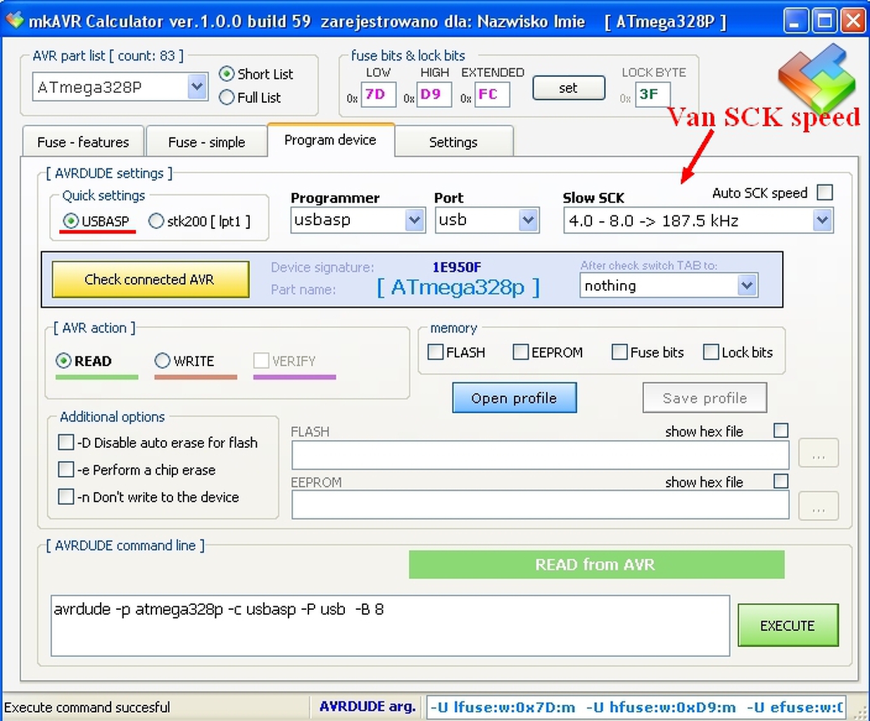 Az mkavrcalc progiban low:7D high9 extended:FC a fuse bitek, ennél meg teljesen máshogy van. Hol tudom ebben az írás sebességét állítani? Mert szinte biztos hogy az a baj. Az AVR-ek egyébként rendben vannak, mert most mindkettőben fut a program hibásan.
