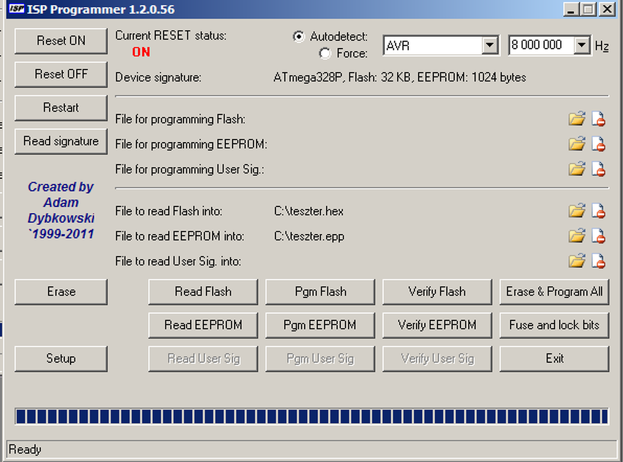 Ha rácsatlakozol a programozóval , és van AVR is , akkor autodetect - be felfogja neked ismerni az AVR /bal felső rész / Device Signature . Ha jó minden ennek kötelezően meg kell jelenni ott.