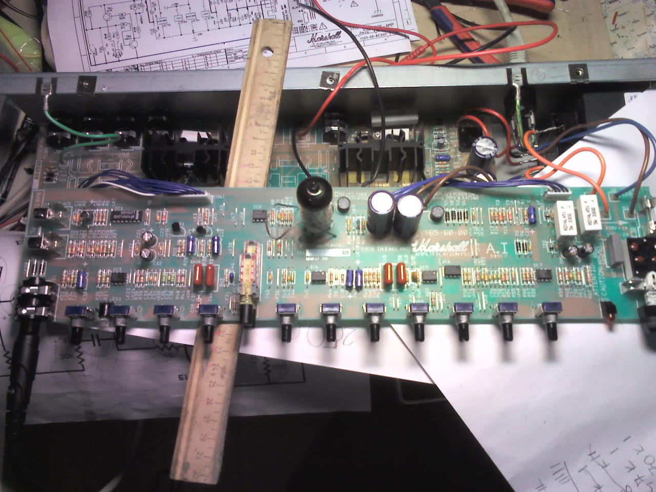 Segítséget kérnék. Hozzám került egy Marshall VS65R. Valaki már belepiszkált. Sérült alkatrészeket nem látok. Az R17, R18 5W-os ellenállás. Elvileg ez csinál a +-40 Voltból +-15-öt. Viszont nincs +-15. Csak 1 V-ot mérek az ellenállások lábain. Egyik felén 40V a másik felén 1 V. És elég hamar fel forrósodnak. Ez miért van?