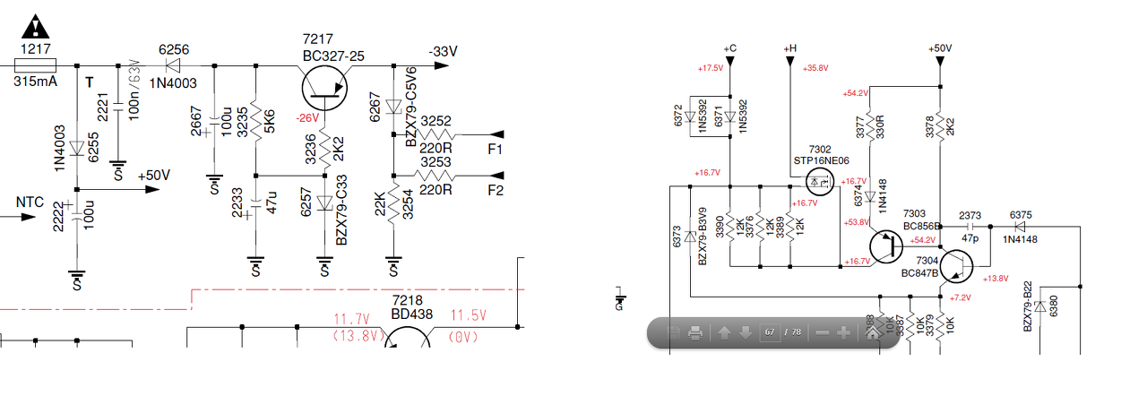 Viszont a B és E feszültség a dokumentumnak megfelelő kb 54V. Csak a C 16,7V helyett majdnem 31V. A másik tranyón a 7,2V helyett 30V a 13,8V helyett 25V.