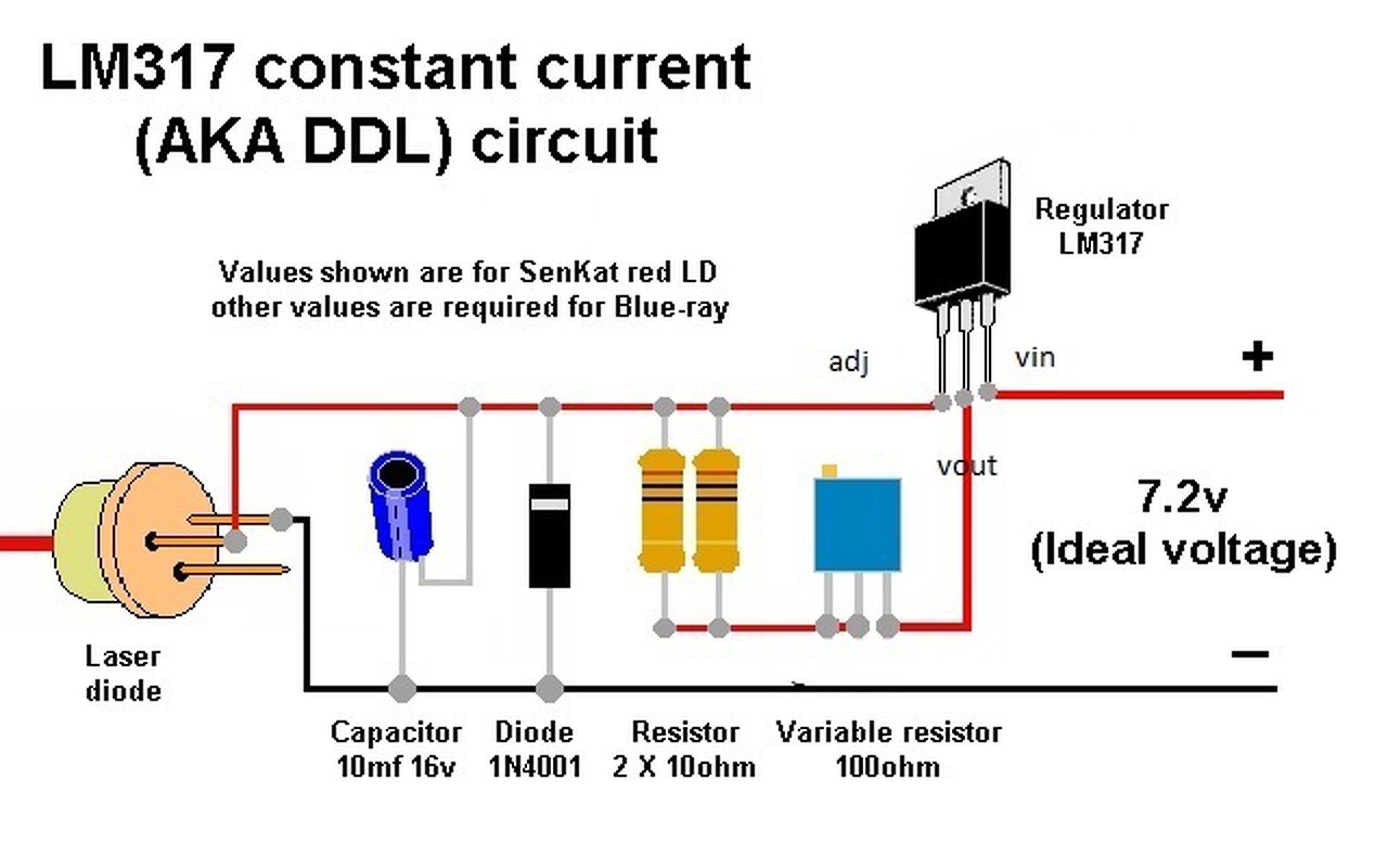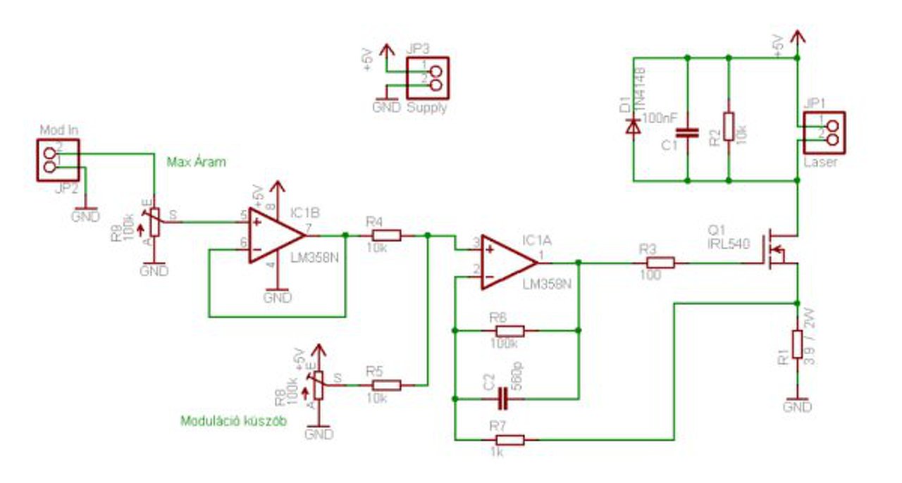 Szia!Ez a kapcsolás kiégetné a lézerdiódát.A 7,2 volt kicsit magas .Megépítettem és a potival a mA lehet csak szabályozni max 300 ig azt hiszem