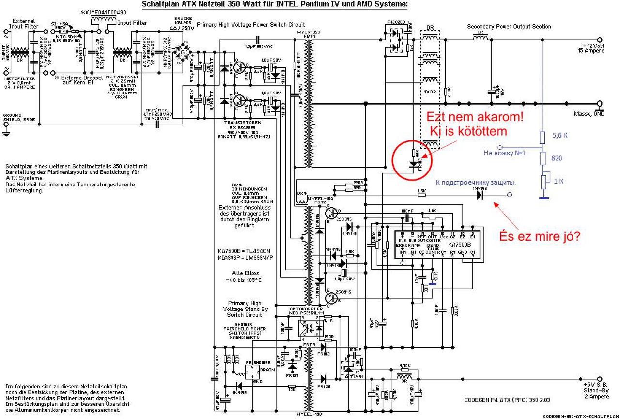 Ma alakítgattam a KA7500-as AT tápot, ahogyan írtátok is. Az 1-es lábáról volt egy ellenállás a föld felé, egy az 5V felé, és egy a 12V felé. Én a láb körül elvágtam a vezetősávot. Az 5V-os ágra csatlakozott még egy 5 lábú kis alkatrész, meg pár átkötés, és gondoltam lehet fontos hogy az eredeti ellenállásokon keresztül földhöz jussanak, ezért nem csak simán kiszedtem a gyári 3 ellenállást.