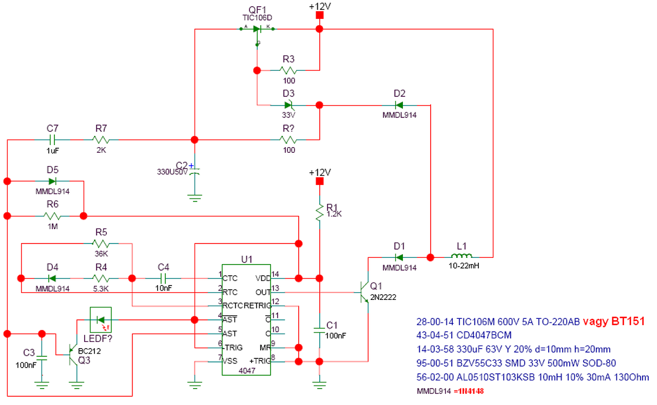 Egy olyan kérdésem lenne, hogy kb. 2 hete vettem egy német gyártmányú akku aktivátort, mellékelem hozzá a kapcsolási rajzot, HEF4047B IC-s. Ma arra lettem figyelmes, hogy nem sül ki, nem villan az elektronika. Szétszedtem, a BT150-es tirisztor halt meg. Kérdésem az lenne, hogy mitől halhatott meg, és innentől ilyen sűrűn meg fog halni? Az autóra csipesszel fogattam az elektronikát, menet közben rajta volt, de ha töltöttem az akksit, akkor leszedtem róla a pozitívot a biztonság kedvéért, és így is meghalt. A másik kérdésem az lenne, hogy BT151-el tudtam helyettesíteni, és így nem fog nőni az áramkör áramfelvétele? Előre is köszönöm szépen a segítségetek! További szép napot!