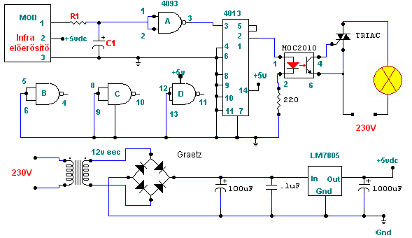 Az áramkör tutira müködik, a hátránya, mindnen infra távra reagál. Egy gomb nyomás be egy , ki.