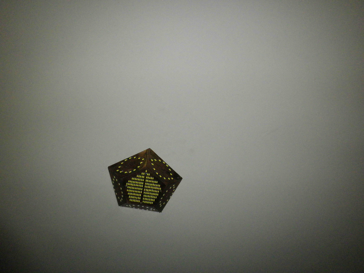 Elkészült az ötszög alakú ledlámpa. Összesen 231 db ledet tartalmaz. Az ötszög 161 db-ot. A trapézok 14*7 db-ot. 7-es sorokba kötöttem a ledeket, elöttük 180 ohmos ellenálás. Led vezérlő trafó hajtja, kb 23 voltra letekerve. A lámpa belsejébe applikáltam még egy 8X8-as ventillátort. A mennyezeti gipszkartonba egy 7cm átmérőjű lyukat vágtam, ezen szívja ki a meleg levegőt a panelről. Ventillátorral együtt 0.42 A áramot vett fel. Ez pont 10 W. Fényerő remek. Melegedni nem melegszik a lámpatest.