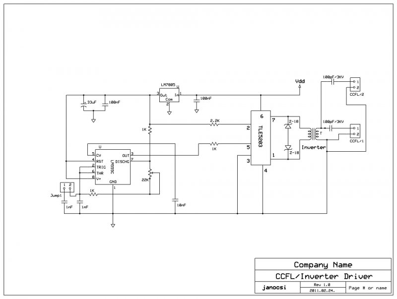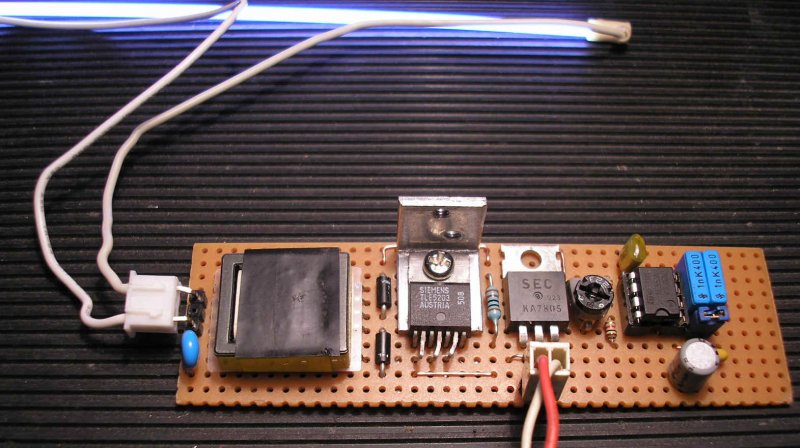Készítettem egy ”gyári” inverter transzformátor meghajtó áramkört, ahol a trafó egy integrált H-hídra van kapcsolva. (Az inverter tarfó egy hibás LCD monitorból került itt felhasználásra.) /Az alapötlet a Wand Clock-hoz kidolgozott tekercsmeghajtó áramkörömből származik, de már a propeller clock óránál is sikeresen használtam fel./ Ebben az áramkörben, TLE5203, MOSFET-ek kapcsolgatják a tápfesz polaritását az inverter trafó primer tekercsére, így a kisebb tápfesz, (12V!), bőven elég teljesítményt nyújt a nagyobb terhelésű CCFL csövekhez is. Ez a kísérleti (próbapaneles) áramkör csak a legszükségesebb elemeket tartalmazza. Érdekessége a kapcsolásnak, hogy a szóban forgó hídáramkör logikai (5V!) szintű feszültséggel vezérelhető az egyik bemenetén, míg a másik bemenete GND-re van kötve, Szigorúan, időben egyforma négyszögjelekkel célszerű vezérelni, mert a híd mindkét irányú logikai szintnél (ellentétesen) vezet, különben ”sántít” a kimenetre jutó meghajtó feszültség kitöltése. A híd vezérlését egy 5V tápról működő 555-ös szokványos astabil alapkacsolás végzi, amely 20KHz-60KHz-es tartomány között szabályozható a legideálisabb értékre beállítva. Az áramkör kényelmesen elviseli a szükséges terheléseket, ahol már csak az inverter trafó terhelhetősége szabhat határt. A CCFL csövek 3-5W körüli terhelést jelentenek darabonként, így 12V tápfeszről 0.5A-1A körül is lehet az áramfelvétel két cső esetében. Végezetül néhány kép a működő áramkörről és a kapcsolási vázlatról.