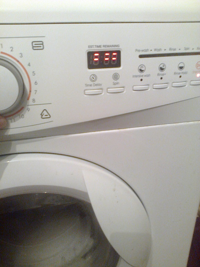 Most már "él" a mosógép, de nem rendes. A kijelzőjén , ami a hátralevő időt is mutatja, néhány vízszintes karakter is megjelenik. Például az 1:33 mosást 7:33-nak írja. Másik dolog, hogy halk zizegés szerű hangot lehet hallani a panelról. Nem tudom, hogy ez számít e.