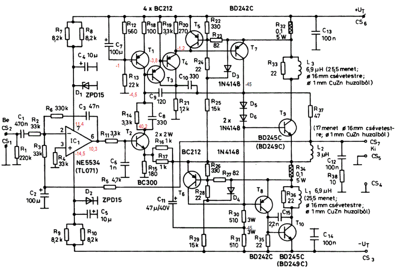 Az előbbi rajzon C15 és 2,2nF érték, de jó az 1,5 nanó is. A negatív tápoldali T10 bázis-kollektor közé való.