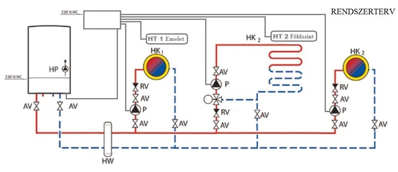 DE a Jelenleg a hidraulikus váltó előre menő ága két felé megy nálam. Az egyik egy radiátoros kör ami mondjuk a rajzodon a HK1. A különbség, hogy nálam a körben lévő szivattyú a visszatérő ágba került és ahogy írtam nem tudom mi az AV és RV. A másik köröm a padló kör a HK2. A rajzon itt is AV és RV van majd utána szerintem az a keverő szelep aminek a fényképe is ott van. Nekem a helyett most egy sima kapilláris szabályozó szelep van beépítve. Utána jön a szivattyú ami szívja a visszatérő osztót és a szabályozó szelepen átengedett vizet. A rajz alapján ezt kell kiiktatni úgy, hogy a keverő szelep egyik ága legyen az előre menő, míg a másik ága a padló gyűjtő végéről a visszatérő. Ebből a kettőből fogja kikeverni a szivattyú által szívott vizet ami megy a padló előre menőbe. így ok?