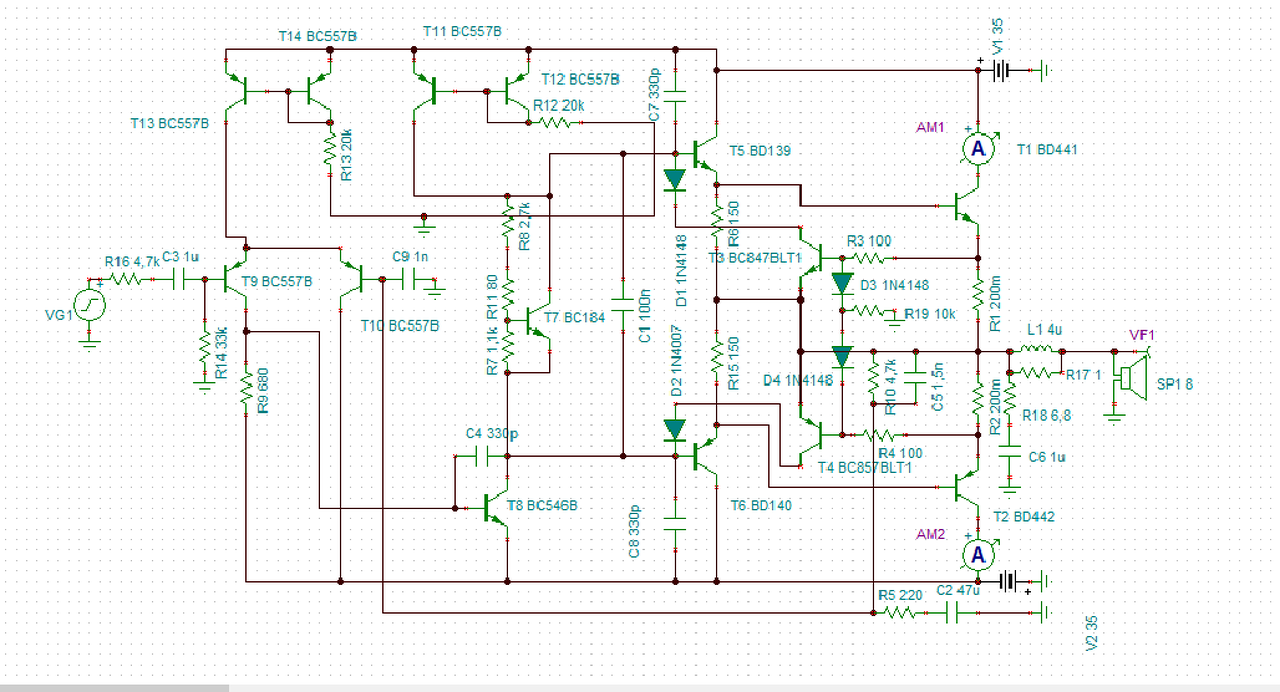 A szimuláciú szerint ott nem lehet akkora :/ . Az a baj hogy az az áram még csak nem is a teljesítmény tranzisztorokon ment el, hanem az előfokozatoz meg az áramtükrön. Kicseréltem az áramtükröt generátorra. Spórolásként diódával oldottam meg.