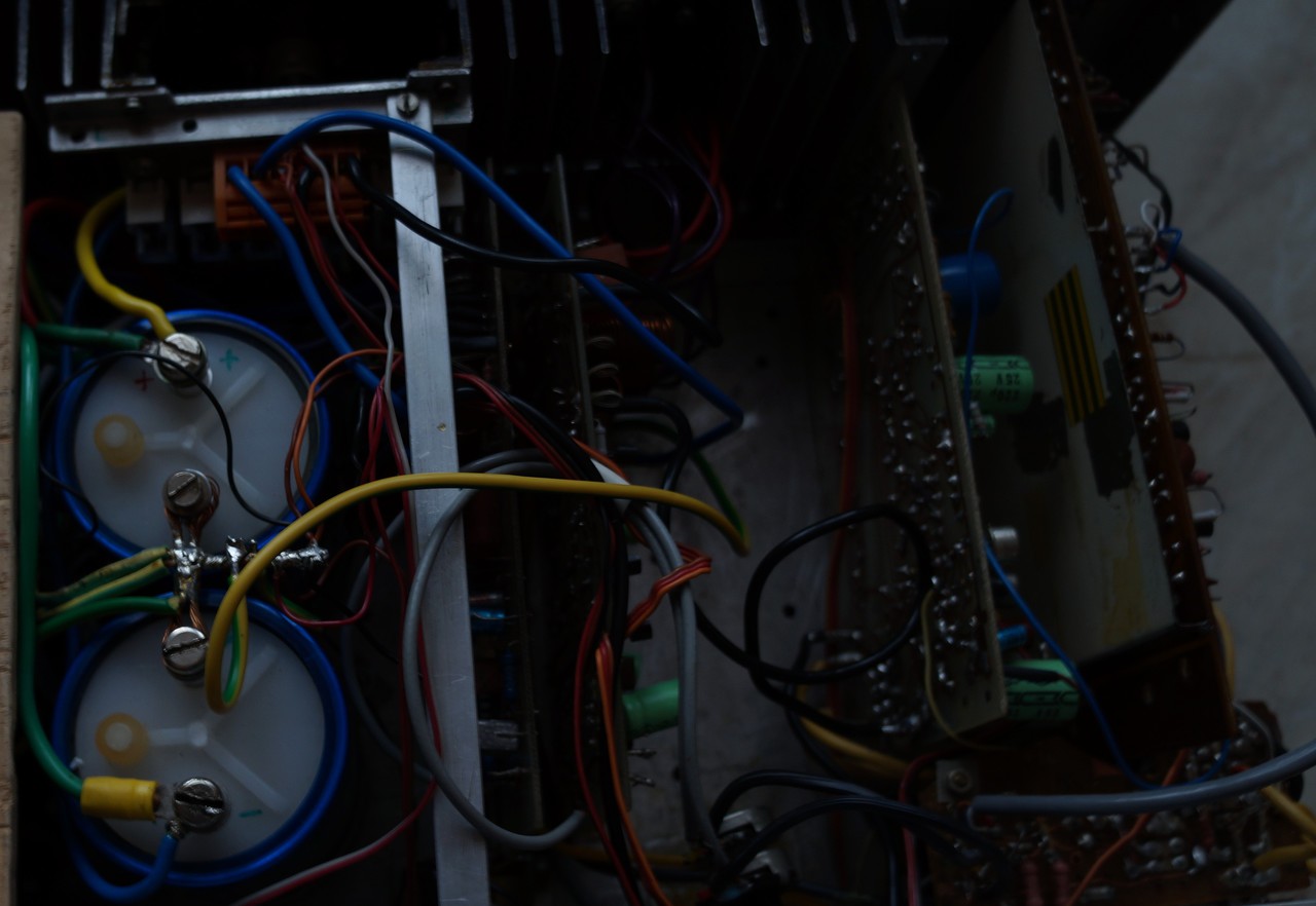 A ház jó része egyedileg készült, az eleje szerintem egy Videotoné volt. A hangfal csatlakozások a fenti képen látható narancssárga csatlakozó és biztosítéktábla mögött vannak. Ott van egy monitor bemenet is. A többi bement oldalt van egy nagy nyákon. Kiszedtem az egyik hangfalcsatlakozót. Kicsit meglepett amit láttam.