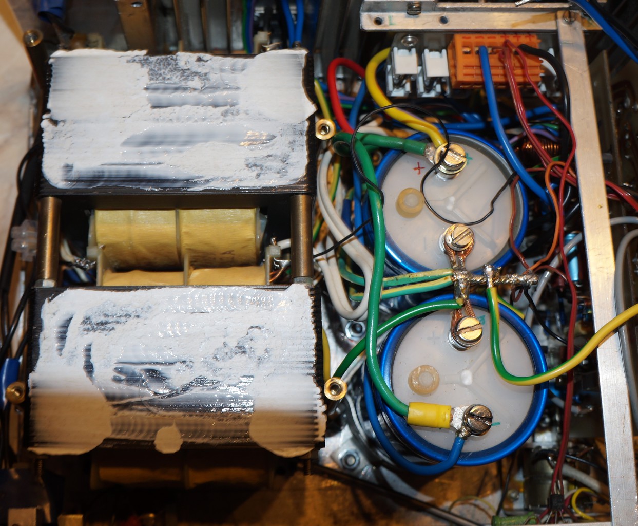 Nem nagyon látszik. Eléggé össze van zsúfolva. A képen a fentebbi kondi kék széle és kettő zöld vezeték közötti háromszögben látszik a csavarja. Az alaplemezhez van csavarozva.