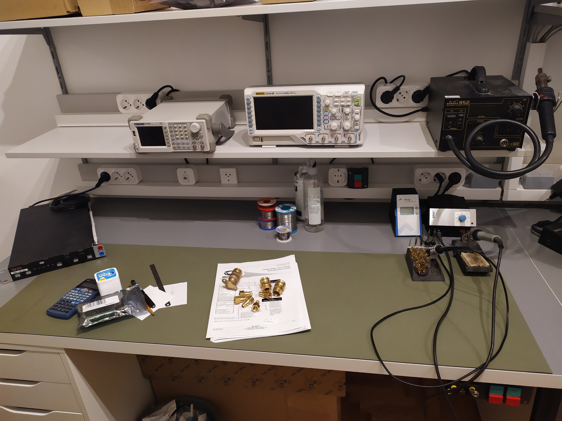 Végre elkészültek az én asztalaim is. Gyorsan le is fotóztam milyen egy rendezett, tiszta asztal, ilyen állapotban úgysem lesz gyakran. Ezzel megszabadultam a hosszabbítóktól és a rengeteg összegubancolódott tápkábeltől, ennyi aljzat egy darabig elég lesz. Ezen kívül lett 24V-os kiállás minden asztalon, leválasztott 230 és még kerül fel pár levegő csatlakozás is. Eltűntek az összegabalyodott Ethernet kábelek is. Most van minden géphez, műszerhez külön aljzat, elég egy rövid patch kábellel bekötni. És ahogy lenni szokott, amint elkészültem máris jöttek az újabb igények. Akarok még usb aljzatokat is a falra, a nem Ethernetes műszereknek vagy soros debugoláshoz. de ehhez a hub-ot valószínűleg magamnak kell megcsinálnom, ami megfelel a méretbeli és port kialakításokra vonatkozó igényeknek. Valami dimmelhető LED-es világítást akarok még forrasztáshoz. A polcok sajnos eléggé leárnyékolják az asztalt. A végére pedig még egy kép belefér a fiókok beltartalmáról.