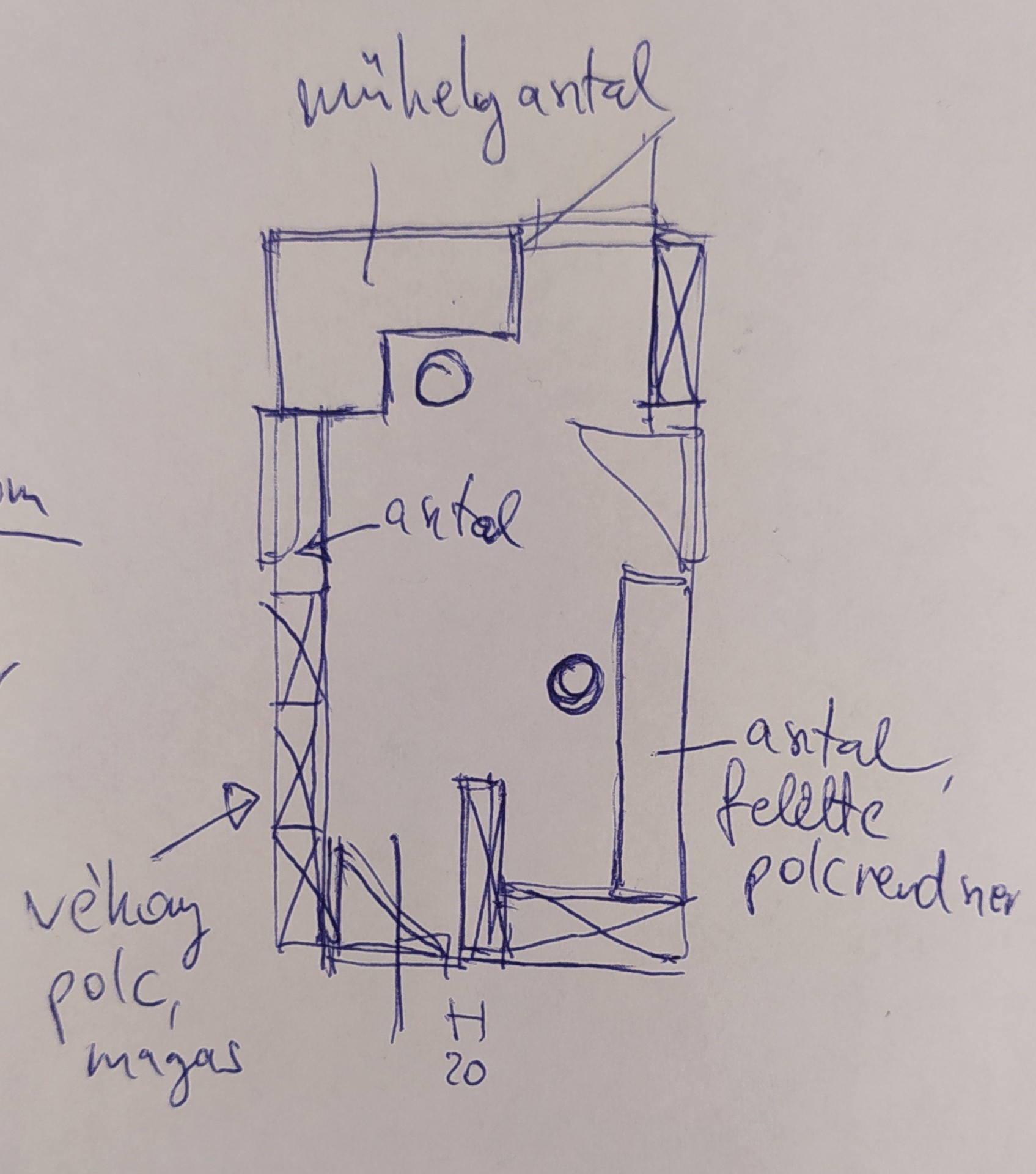 A műhelyasztalodnál vigyázz az éles sarkokkal, tuti, hogy sok zúzódást fogsz szerezni miattuk ennyire szűk helyen Az asztalod funkcióját, a rajta való munka milyenségét is vedd figyelembe! Állnod kell majd mellette, vagy ülni, nem mindegy abból a szempontból, hogy székkel be kell-e tudnod húzni magad alá, vagy sem. Amelyiknél nem kell behúznod magad az asztal alá, oda mehet fiókos szekrény a szerszámoknak.Az ajtódnál én nem raknék be egy szűkítőt - az a belógó 20cm-es szekrény nem túl kényelmes szerintem, pláne, ha valamit be / át kell vinni a szobán. Elektromos tápellátás most hogyan van a szobában? Azt meg akarod bolygatni?