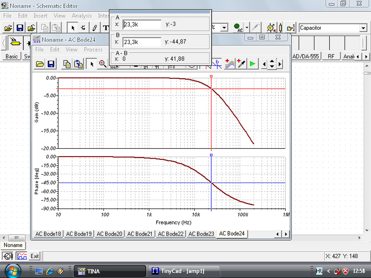 Egy felüláteresztő szűrő R100K, C68nF számításaim szerint 23,4kHz-nél vág. A diagramján ha -3dB-el csökkentem az erősítést, akkor látszik a 23kHz, de már 1kHz környékén csökken a frekvenciaátvitel ha jól értelmezem a képet. Ez miért van, vagy pontosan mit jelent a gyakorlatban?