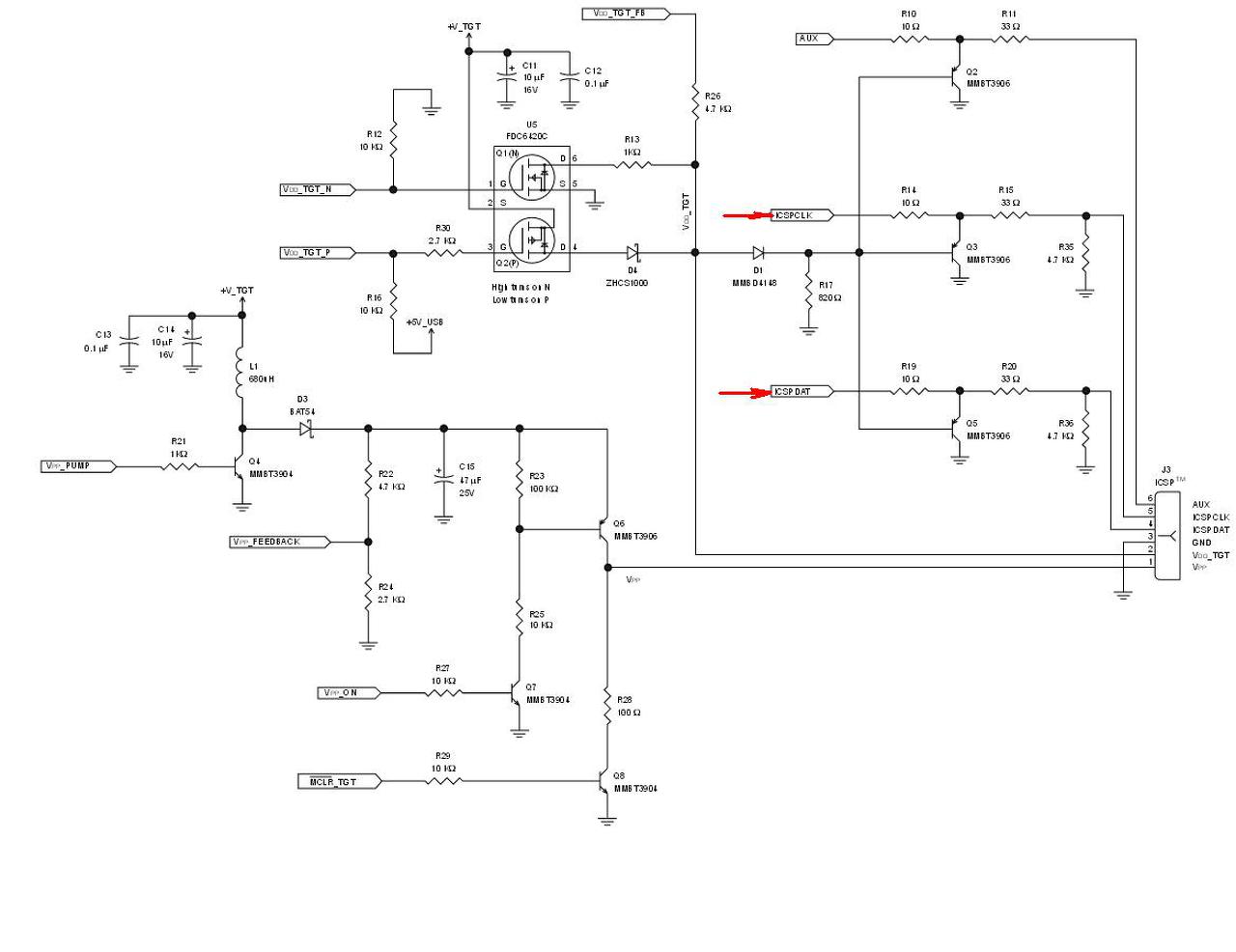 Megnéztem a PICKIT2 kapcsolási rajzát, és ez nem nyugtatott meg. Lényegében egy sorosan kapcsolt 10 és 33 Ohm -on keresztül néznek szembe a portok. Ez nem igazán védne meg a kritikus áramoktól. Persze lehet olyan üzemmódja a rendszernek, hogy a PICKIT2 ha éppen nem programoz a beépített PIC lábak bemenetnek definiáltak. Ha meg programoz csak az MCLR aktivitása után válik kimenetté a PGD és a PGC. Szóval kell aggódni amiatt hogy a PIC ben futó program zavarhatja a PICKIT2 -t?