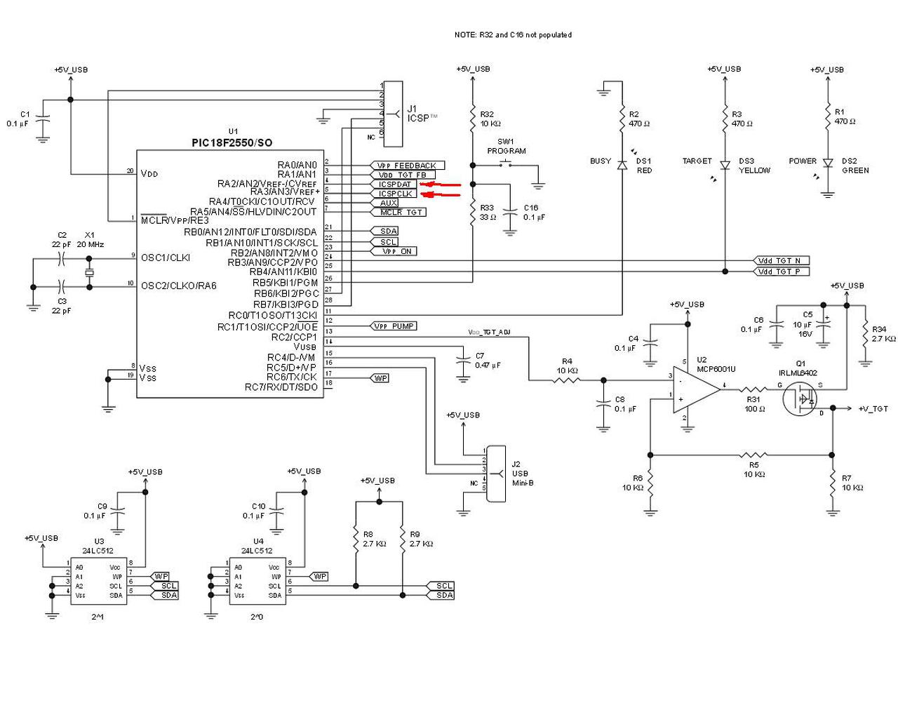 Megnéztem a PICKIT2 kapcsolási rajzát, és ez nem nyugtatott meg. Lényegében egy sorosan kapcsolt 10 és 33 Ohm -on keresztül néznek szembe a portok. Ez nem igazán védne meg a kritikus áramoktól.