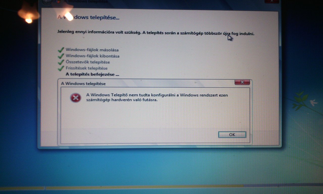 Interneten találtam rá megoldást, DVD-ről kell telepíteni, mert merevlemez illesztőprogramot nem tölti be újraindítás után.(Több helyen írják, elég érdekes: először minden oké, felmásolja a fájlokat, majd újraindítás után már nem tudja kezelni.)