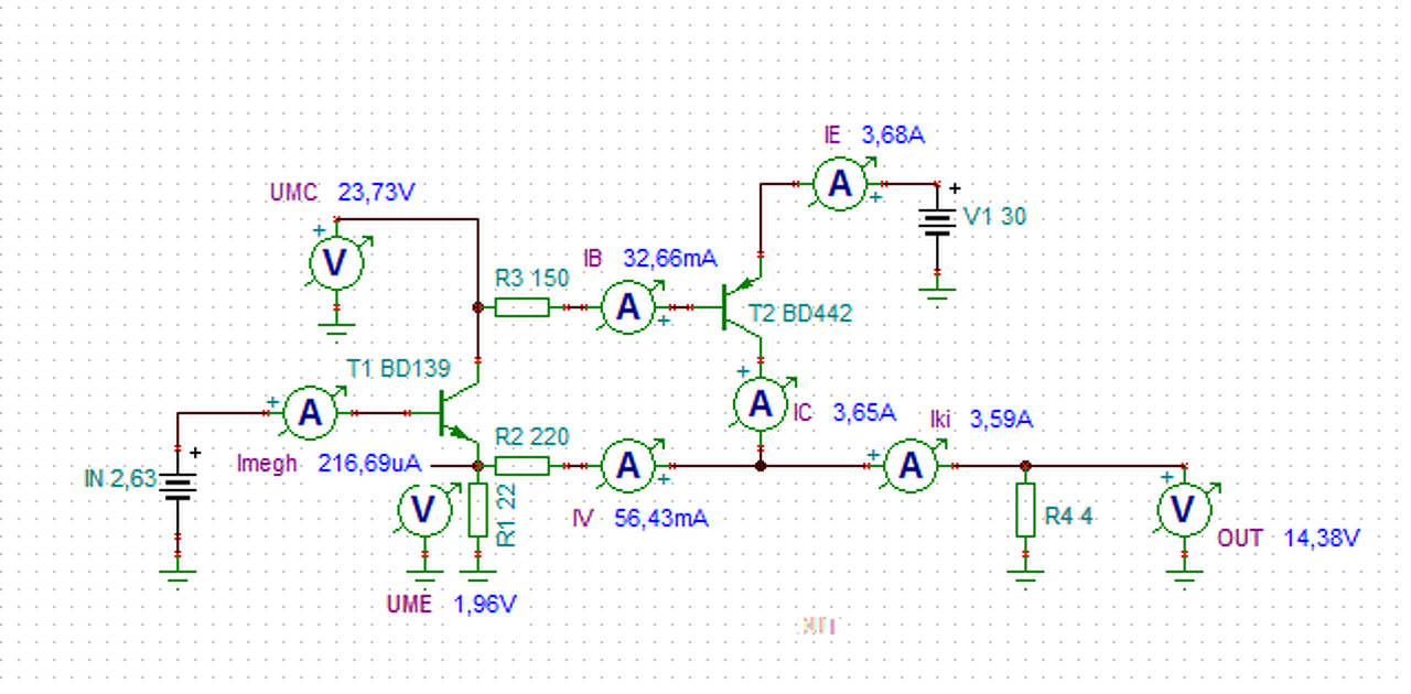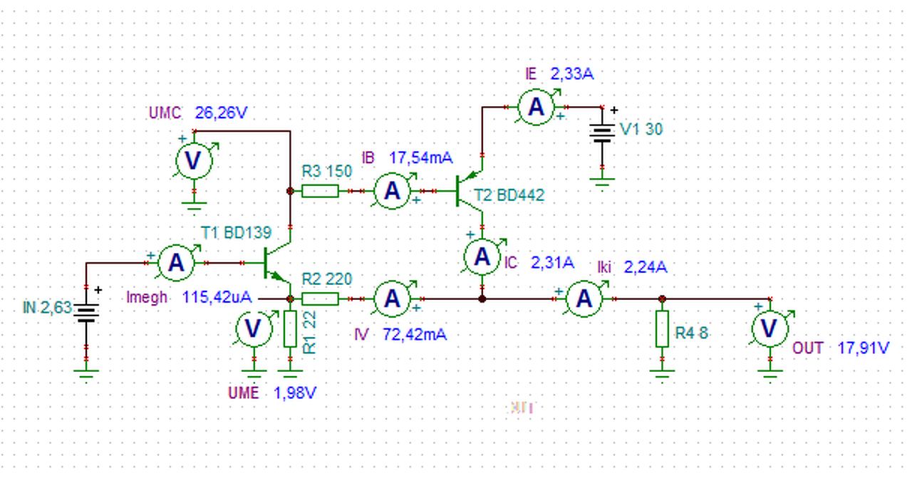 25V/150 Ohm = 160mA. Ez szorozva 20 -szal (a végtranyó bétája)... kb. 3,2A. Ez az, amit lineáris tartományban ki tud magából préselni ez a kapcsolás.