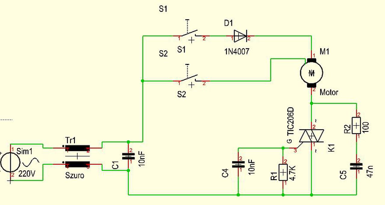 Azt hittem a triakok nem tudnak nekem meglepetést okozni, de tudnak. Az alábbi kapcsolással van gondom A motor, a zavarszűrő és a kapcsolók egy kis háztartási gépet alkonak, a triakkal szeretném ki-be kapcsolni. Így, ahogyan le van rajzolva, az S1 nyomógombbal nem csinál semmit, az S2-vel viszont forog a motor. A triakon 125 V fesz van, tehát úgy tűnik diódaként működik. Két triakkal is próbáltam, mindegyik ugyanezt műveli, műszer szerint mindkettő jó. Ennek nem lenne szabad gyújtania Mit nézek el, vagy mit tudok rosszul? A hozzászólás módosítva: Jan 10, 2016