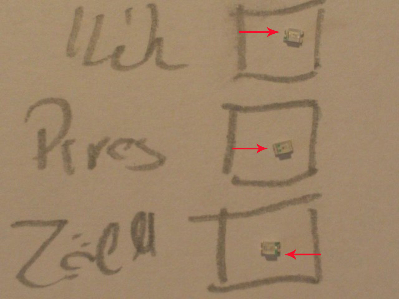 Sajátos tapasztalat, hogy nem mindegy , hogy vonal, vagy pont van jelölésként az SMD led-eken. Ki kell mérni minden esetben. Akkor elkerülhető a téves forrasztás.