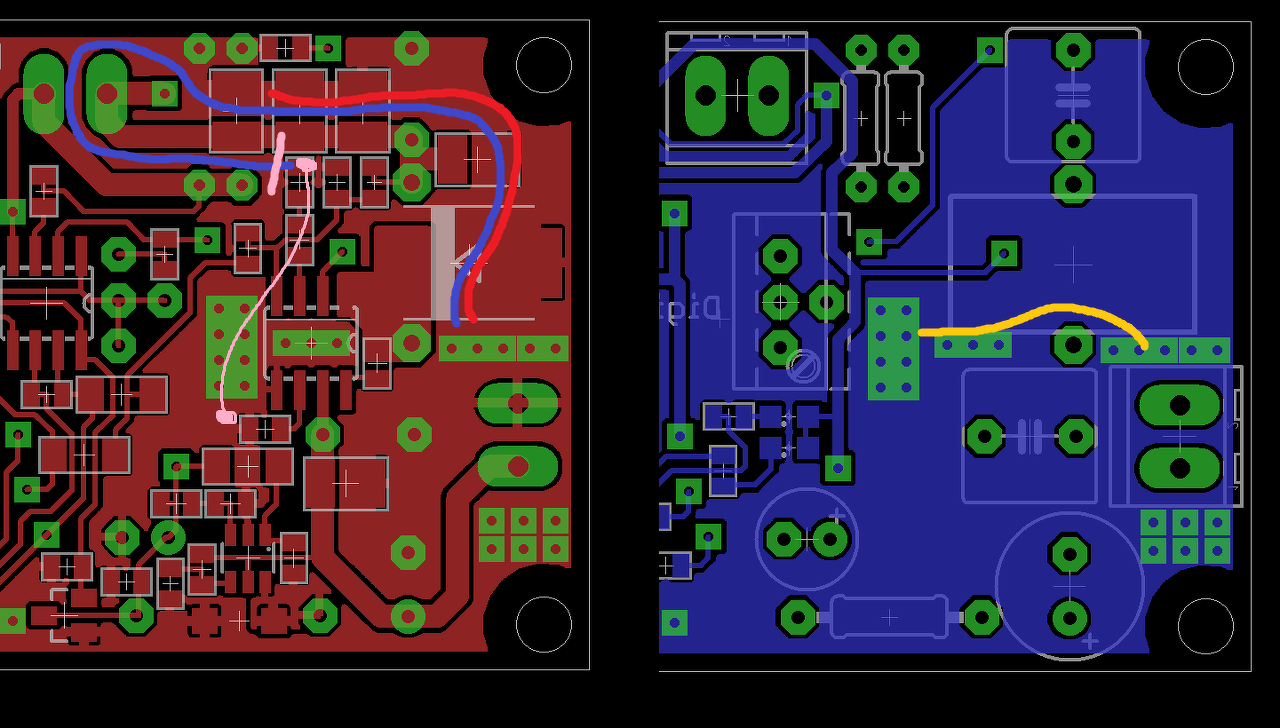 Idézet: „Nagy áramú körnek jót tesz ha kicsit hosszabb mivel ad egy kis plusz öninduktivitást a szűrő körnek. A baj az hogy ebbe a körbe bevontad a gyengeáramú vezérlés körét is ami a piros meg sárga szakaszon jól megszórja zajjal az pedig megemeli a 3-4 lábat a GND-ről az 5. lábhoz képest.” Igen. Viszont most már a vezérlés jó helyre került, azaz már nem játszik bele a nagyáramú ág. Így már a pirossal jelölt rész nem lehet probléma. Lehet adok még egy esélyt neki és építek egy harmadik prototípust. ![]() Viszont akkor már külső DAC lesz meg még variálok rajta pár dolgot...