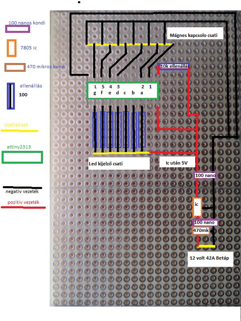 A két 100 nF-os kondenzátor a lehető legközelebb legyen a 7805-ös IC-hez. A kontroller +5 V-os lábához a lehető legközelebb szintén egy 100 nF-os kondenzátort tervezz (a kondi másik lába a GND-re megy). A 7805-ös bementére érdemes egy nagyobb kondenzátort is rakni, kb. 47 - 100 µF elég. A mágneskapcsolóknál lévő GND vezetéket le tudod ágaztatni a kontroller negatívjához, nem kell duplán vinni a vezetősávokat a 7805-ös után.
