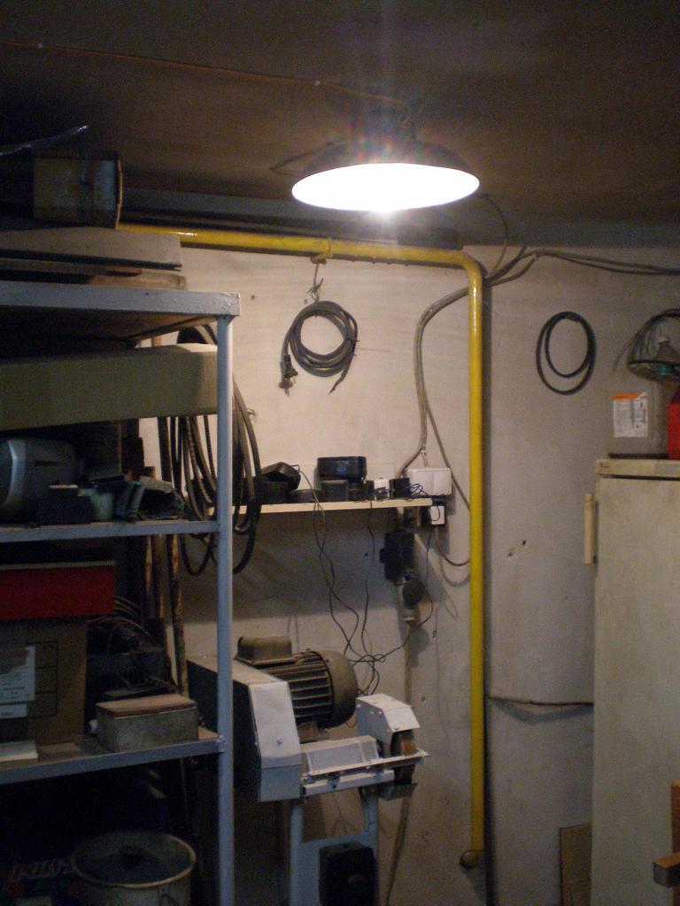 Felkerült egy lámpa a köszörű fölé, most már látom, hogy mit csinálok. A köszörű fölött a falra szintén most került fel a polc, itt vannak az akkumulátoros csavarbehajtók akkumulátorai illetve a töltők. Lett ide húzva villany is, három fázis a köszörűnek és egy fázis a lámpának és a töltőknek.
