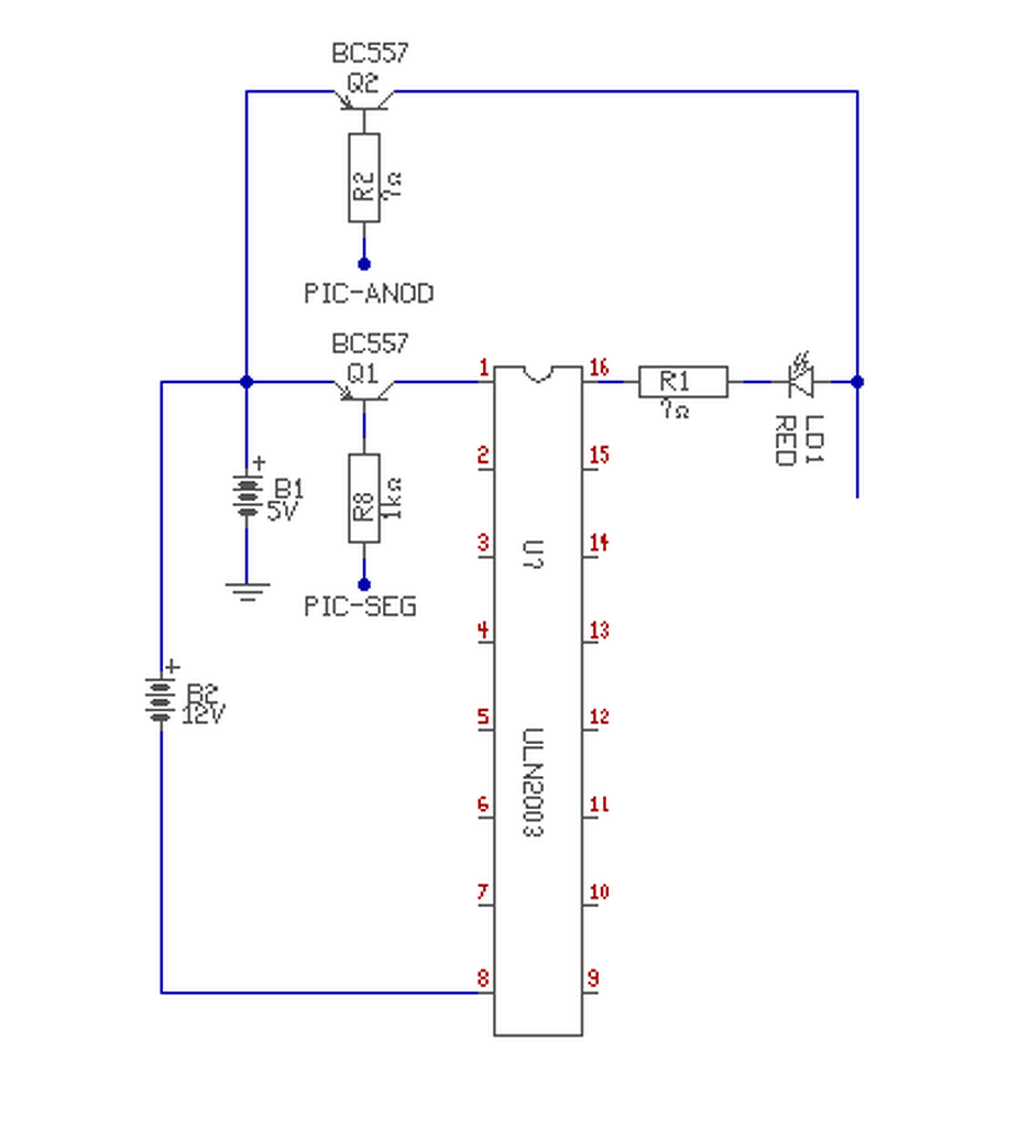 Hello! Ha igaz, akkor egy UDN2981 IC-vel tudod orvosolni a dolgot. A katódokat továbbra is a beépített tranyók hajtják meg, a PIC hét szegmens kimenetét (7db 1kohm) az UDN bemenetére vezeted. Az UDN kimenetét áramkorlátozó ellenálláson keresztül a szegmensekre. Az UDN 9-es lábára +12V-ot adsz. A 12-es lábra közöd a 12V negatív pontját, és ezt összekötöd az 5V GND pontjával.