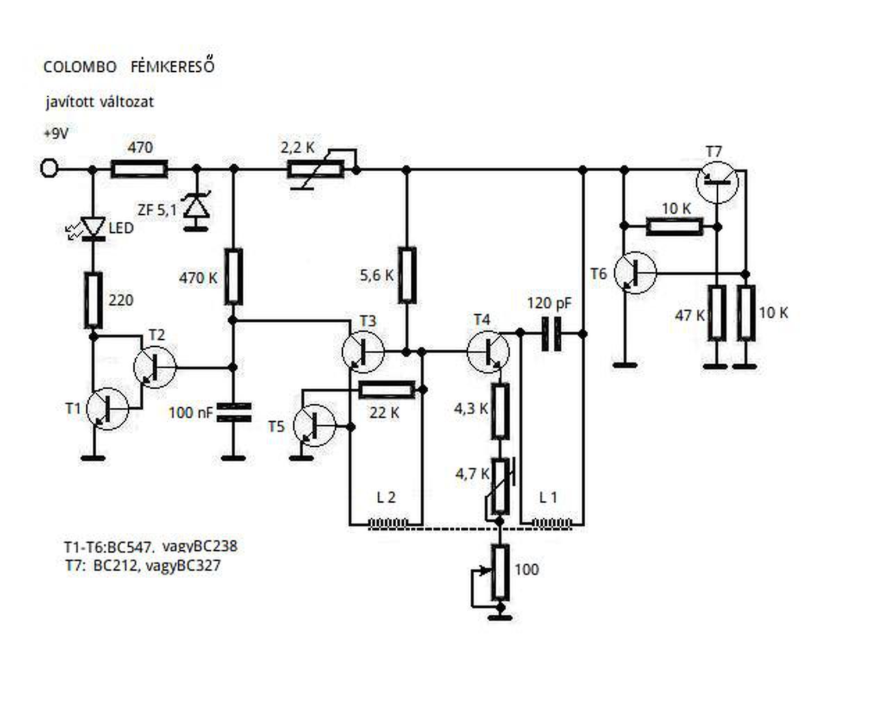 Tiszteletem a kollégáknak. Csak azért jelentkezem, mert a COLOMBO fémkeresőt feljavítottuk egy projekt keretében. Számtalan más gyári készülékkel összehasonlítva falban levő vezetékek nyomvonalának felkutatására ez a legjobb. A beleépített plusz egy tranzisztor a van találat-nincs találat közti hiszterézis megszüntetésére szolgál. A működési frekvenciát felvittem 1 MHz környékére, Így az érzékelés távolsága az eredeti 4-5 szörösére nőtt. Valamint a ZF 5,1 zénerrel megvalósított plusz stabilizátornak köszönhetően a beállított érzékelési küszöb sokkal stabilabban megmarad, mint az eredetinél. Egyébként én is csak úgy lerajzoltam, amikor nálam járt egy, mint ahogy figuraferi is feltette az előző oldalon, és többször utánaépítettem, jól működtek, de most valakinek kellett egy sokkal jobb, és kísérletezgettem vele. A dióda helyére betett tranzisztor bázis- emitter diódája adta magát, de nem lett nyerő még egy darlington, viszont a kollektort nagyon sok helyre bekötöttem, hogy hol mit csinál, és ez lett a legjobb. Segítí az oszcillációt, és úgy általában stabilabbá teszi a működést, meglepően érzékenyre lehetett ezután a készüléket beállítani. A 22 kiloohmos ellenálás eredetileg egy 220 K trimmerpotenciométer volt, de úgy tapasztaltam, hogy az az érték mindig 25 kiloohm körüli állásnál hozta az ideális érzékenységet, ezért lett végül fix ellenállásra cserélve. A keresőtekercs adatai: L1: 60 menet, L2: 20 menet zsebrádió ferrit rúdon, a rezgőköri tekercs a rúd legszélén kezdve, befelé haladva, menet-menet mellé, L2 szorosan mellette, a bekötéskor figyelni kell arra, hogy a trimmerek max tápfesz, T4 emitter testen az oszcillátornak mennie kell, a LED elalszik, ha nem, akkor fordítva kell az L2 tekercset bekötni. A tápfesz. trimmerét középállásba kell tekerni, a 4,7 kiloohmossal a LED megszólalási küszöbét kell megkeresni, illetve ha ez a szabályozási tartományon kívül esne, akkor lehet korrogálni a tápban levő 2,2 kiloohmossal. A + tápfesz és a LED meghajtó darlington kollektora közé lehet egy 5 Voltos piezó csipogót tenni, aki az akusztikus jelzést szereti.