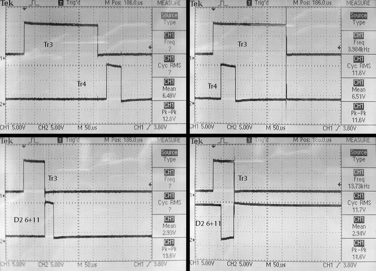 DP-nél a Tr4-nek hol kell lennie? Ha nincs tekercs rákötve, akkor a Tr3 lefutó éle után van valamivel, de ha rákötöm a tekercset, akkor a Tr3 felfutó éle után. Ha a Tr3 rövid, akkor a Tr4 és Tr5 teljesen eltűnik, ha a Tr4-et a Tr3 lefutó éle utánig tolom. Ekkor a D2A IC kimenete végig magas. Ez így normális?
