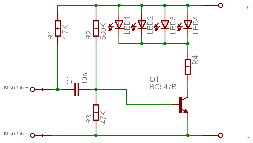 Az áramkör alapból úgy működik, hogy csak hangra villan, és abbol is csak az erősebbekre. Az áramkör 4,5V-rol üzemel. Nagyobb feszültségnél már előjön a folyamatos világítás, akkor az 560K-R2 értékét lehet növelni. Milyen feszültségről járattad, és milyen mikrofont használtál?
