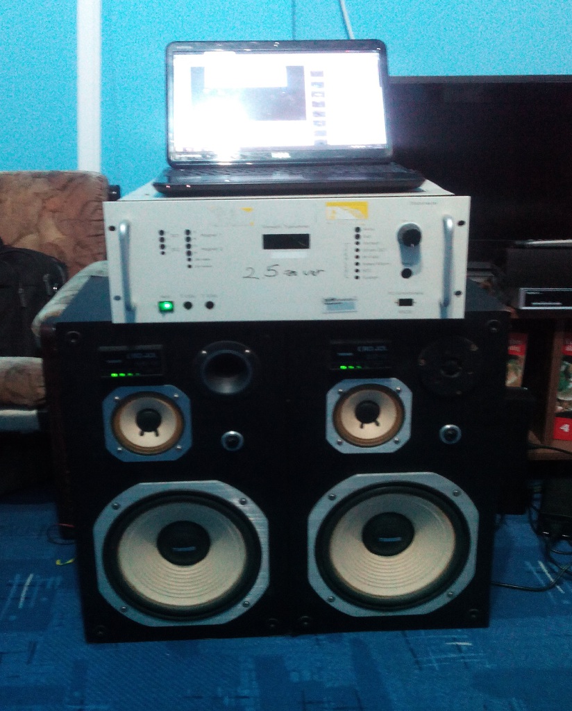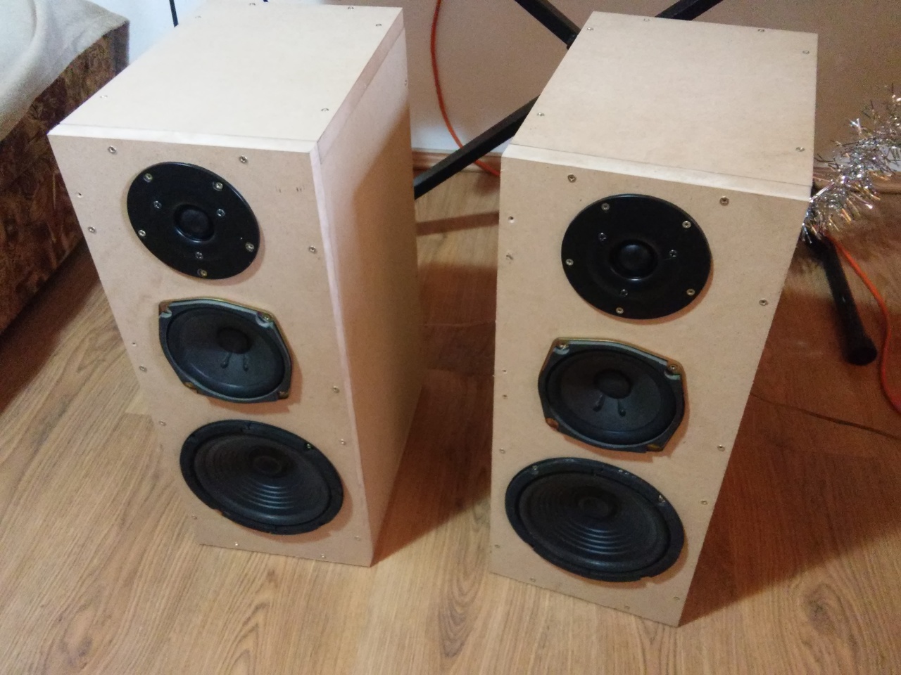 Kettő napi szerzeményem. 3 utas: M.N.C. mélyközép (~90W/8Ohm) Toshiba közép (~20W/8Ohm) SAL dom magas (~100W/8Ohm). Hangolás igényelnek még, de kezdenek nekem tetsző hangot kiadni. 20 literes zárt dobozban vannak. A doboz MDF anyagból van, asztalosnál méretre vágva. Jelenleg csak csavarozva van, későbbiek folyamán ragasztva is lesz, de eddig nem "fúj ki" sehol sem. Szobai zenehallgatásra, házimozizásra bőven elég.