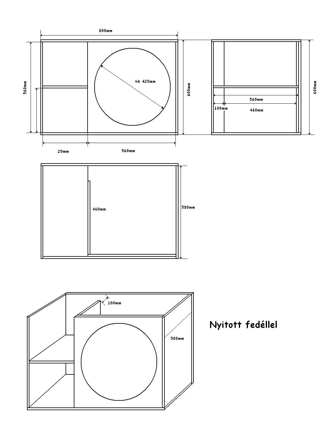 4db 800x600mm teteje és alja 4db 580x560mm oldalai 2db 560x560mm eleje (ebből kell kivágni a 46cm-es átmérőjű hangszórónak a helyét 2db 460x560mm belső falemez 2db 560x200mm felezö reflex nyílás Sok siker az építéshez!!